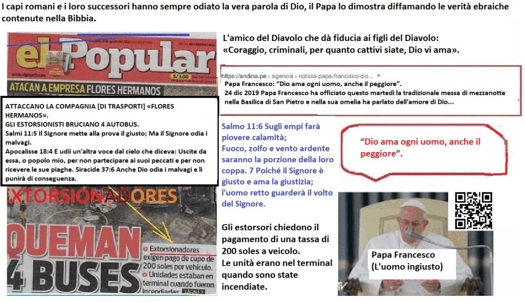 Apocalisse 6:9 Quando aprì il quinto sigillo, vidi sotto l’altare le anime di coloro che erano stati uccisi a causa della parola di Dio e della testimonianza che avevano mantenuto. 10 E gridavano a gran voce, dicendo: «Fino a quando, Signore sovrano, santo e vero, non giudichi gli abitanti della terra e vendichi il nostro sangue?» I veri messaggeri di Cristo e il suo vero messaggio conoscevano le profezie e sapevano che i loro nemici e persecutori intendevano imporre l’inganno globale, poiché sapevano che la profezia in Daniele 8:25 doveva prendere forma affinché alla fine dei tempi, nel ritorno di Cristo, l’inganno fosse distrutto. In Apocalisse 6:9-10, si invoca quindi che Dio adempia le sue promesse di giustizia come dichiarato in profezie come questa: Salmi 58:10 I giusti saranno felici quando saranno vendicati; laveranno i loro piedi nel sangue degli empi. 11 Allora la gente dirà: «Sicuramente i giusti sono ancora ricompensati; sicuramente c’è un Dio che giudica la terra.» Dov’è l’amore per i nemici in questa invocazione a Dio e in queste profezie? Da nessuna parte. Anche Gesù sapeva in anticipo che i romani non si sarebbero mai convertiti alla sua religione e avrebbero distrutto i suoi messaggi e quelli dei suoi fedeli testimoni, quindi disse questo: Matteo 7:22 Molti mi diranno in quel giorno: ‘Signore, Signore, non abbiamo profetizzato nel tuo nome, e nel tuo nome scacciato demoni, e nel tuo nome compiuto molti miracoli?’ 23 Allora dirò loro chiaramente: ‘Non vi ho mai conosciuti. Allontanatevi da me, malfattori!’ Così come il messaggio in Apocalisse 6:9-10 è un’allusione alla profezia in Salmi 58:6-11, questo messaggio in Matteo 7:22-23 è un’allusione a questa profezia dove è chiaro che egli ama Dio, ma odia i suoi nemici. Se odia i suoi nemici e non era un ipocrita, allora non ha mai detto il messaggio in Matteo 5:38-48. Furono gli ipocriti religiosi «cattolici romani» che, con quel messaggio nella Bibbia che dice «ama i tuoi nemici», massacrarono molte persone in nome della loro religione nell’inquisizione empia, che era sempre a favore degli idoli e non della giustizia, perché la frode e la giustizia sono incompatibili:
