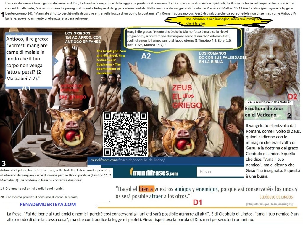 L’amore dei nemici è un inganno del nemico di Dio, lo è anche la negazione della legge che proibisce il consumo di cibi come carne di maiale e pipistrelli; La Bibbia ha bugie sull’impero che non si è mai convertito alla fede, l’impero romano ha perseguitato quella fede per distruggerla ellenizzandola. Nella versione del vangelo falsificata dai Romani in Matteo 15:11 Gesù ci dice (per negare la legge in Deuteronomio 14): «Mangiate di tutto perché nulla di ciò che entra nella bocca di un uomo lo contamina», i Romani accusano così Gesù di qualcosa che da ebreo fedele non disse mai: come Antioco IV Epifane, avevano in mente di ellenizzare la vera religione. Il vangelo fu ellenizzato dai Romani, come il volto di Zeus, quindi ci dicono con le immagini che era il volto di Gesù; e la dottrina del greco Cleobulo di Lindos è quella che dice: «Ama il tuo nemico», ma ci dicono che Gesù l’ha insegnata: E questa è una bugia. Antioco IV Epifane torturò otto ebrei, sette fratelli e la loro madre perché si rifiutavano di mangiare carne di maiale perché Dio lo proibiva (Levitico 11, 2 Maccabei 7). La profezia in Isaia 65 conferma due cose: 1 # Dio ama i suoi amici e odia i suoi nemici. 2# Si conferma proibito il consumo di carne di maiale. Antioco, il re greco: «Vorresti mangiare carne di maiale in modo che il tuo corpo non venga fatto a pezzi? (2 Maccabei 7:7).» Zeus, il dio greco: «Niente di ciò che io Dio ho fatto è male se lo ricevi pregandomi, si rifiuteranno di mangiare carne di maiale?, adorami tutti, quelli che non lo fanno, vanno al fuoco eterno (1 Timoteo 4:3, Ebrei 1:6, Luca 11:28, Matteo 18:7).» La frase: «Fai del bene ai tuoi amici e nemici, perché così conserverai gli uni e ti sarà possibile attrarre gli altri». È di Cleobulo di Lindos, «ama il tuo nemico è un altro modo di dire la stessa cosa», ma che contraddice la legge e i profeti, Gesù rispettava la parola di Dio, ma i persecutori romani no.