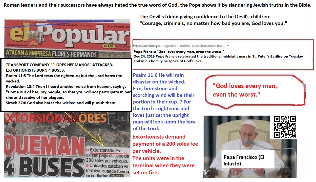 Revelation 6:9 When he opened the fifth seal, I saw under the altar the souls of those who had been slain because of the word of God and the testimony they had maintained. 10 And they cried out in a loud voice, “How long, Sovereign Lord, holy and true, until you judge the inhabitants of the earth and avenge our blood?” The true messengers of Christ and his true message knew the prophecies and knew that their enemies and persecutors intended to impose global deception, as they knew that the prophecy in Daniel 8:25 had to take shape so that in the end times, in Christ’s return, the deception would be destroyed. In Revelation 6:9-10, it is then invoked that God fulfill his promises of justice as stated in prophecies like this: Psalms 58:10 The righteous will be glad when they are avenged; they will bathe their feet in the blood of the wicked. 11 Then people will say, “Surely the righteous still are rewarded; surely there is a God who judges the earth.” Where is the love for enemies in this invocation to God and these prophecies? Nowhere. Jesus also knew in advance that the Romans would never convert to his religion and would destroy his messages and those of his faithful witnesses, so he said this: Matthew 7:22 Many will say to me on that day, ‘Lord, Lord, did we not prophesy in your name and in your name drive out demons and in your name perform many miracles?’ 23 Then I will tell them plainly, ‘I never knew you. Away from me, you evildoers!’ Just as the message in Revelation 6:9-10 is an allusion to the prophecy in Psalms 58:6-11, this message in Matthew 7:22-23 is an allusion to this prophecy where it is clear that he loves God, but hates his enemies. If he hates his enemies and he was not a hypocrite, then he never said the message in Matthew 5:38-48. It was the hypocritical religious “Roman Catholics” who, with that message in the Bible that says “love your enemies”, massacred many people in the name of their religion in the unholy inquisition, which was always in favor of idols and not justice, because fraud and justice are incompatible: