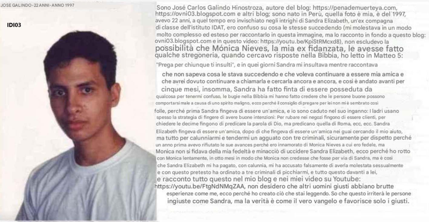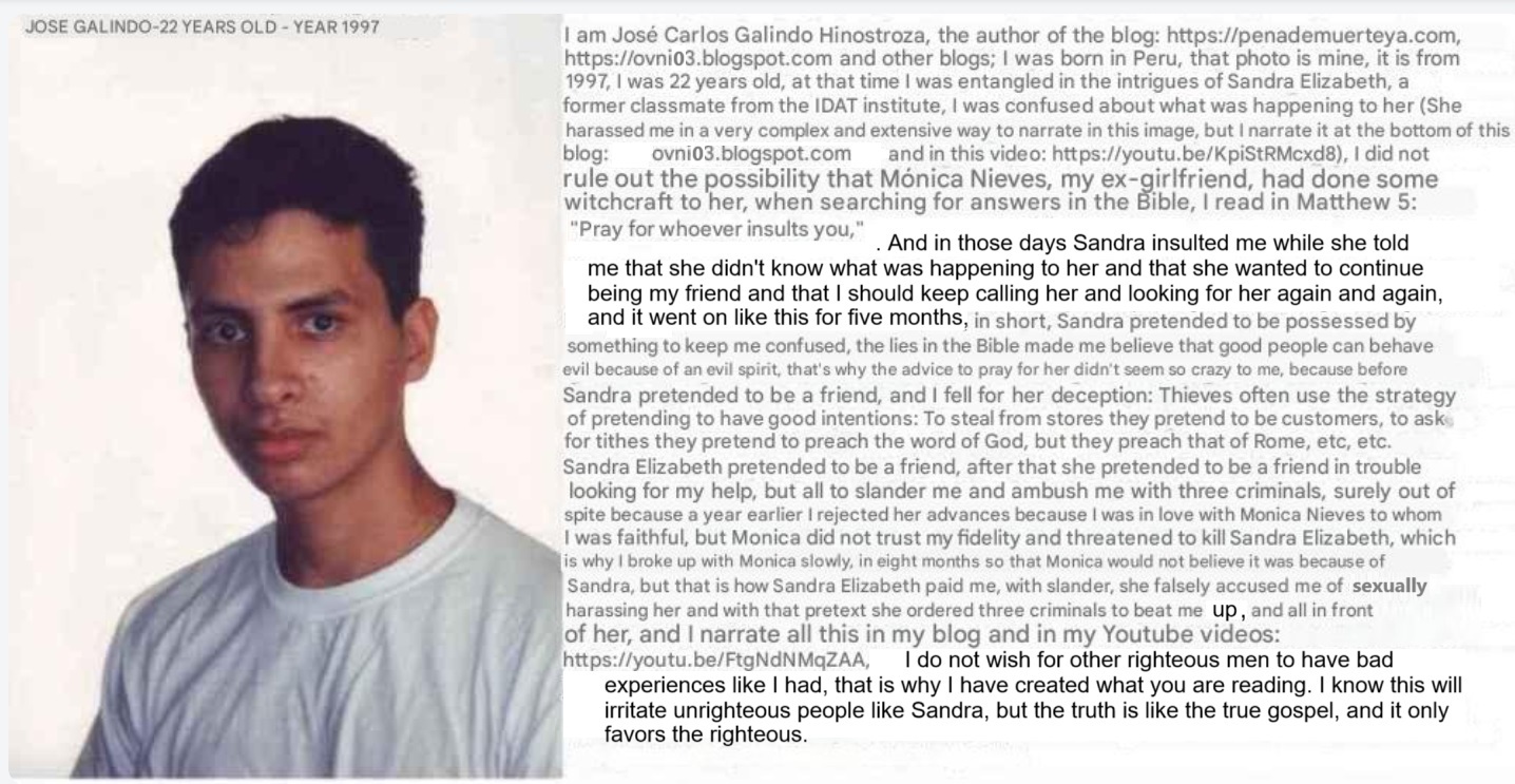 Un duro golpe de realidad es a «Babilonia» la «resurrección» de los justos, que es a su vez la reencarnación de Israel en el tercer milenio: La verdad no destruye a todos, la verdad no duele a todos, la verdad no incomoda a todos: Israel, la verdad, nada más que la verdad, la verdad que duele, la verdad que incomoda, verdades que duelen, verdades que atormentan, verdades que destruyen.This is my story: José, a young man raised in Catholic teachings, experienced a series of events marked by complex relationships and manipulations. At 19, he began a relationship with Monica, a possessive and jealous woman. Although Jose felt that he should end the relationship, his religious upbringing led him to try to change her with love. However, Monica’s jealousy intensified, especially towards Sandra, a classmate who was making advances on Jose. Sandra began harassing him in 1995 with anonymous phone calls, in which she made noises with the keyboard and hung up. On one of those occasions, she revealed that she was the one calling, after Jose angrily asked in the last call: «»Who are you?»» Sandra called him immediately, but in that call she said: «»Jose, who am I?»» Jose, recognizing her voice, said to her: «»You are Sandra,»» to which she replied: «»You already know who I am.»» Jose avoided confronting her. During that time, Monica, obsessed with Sandra, threatened Jose with harming Sandra, which led Jose to protect Sandra and prolong his relationship with Monica, despite his desire to end it. Finally, in 1996, Jose broke up with Monica and decided to approach Sandra, who had initially shown interest in him. When Jose tried to talk to her about his feelings, Sandra did not allow him to explain himself, she treated him with offensive words and he did not understand the reason. Jose chose to distance himself, but in 1997 he believed he had the opportunity to talk to Sandra, hoping that she would explain her change of attitude and be able to share the feelings that she had kept silent. However, Sandra never gave him clear answers, maintaining the intrigue with evasive and counterproductive attitudes. Faced with this attitude, Jose decided not to look for her anymore. It was then that constant telephone harassment began. The calls followed the same pattern as in 1995 and this time were directed to the house of his paternal grandmother, where Jose lived. He was convinced that it was Sandra, since Jose had recently given Sandra his number. These calls were constant, morning, afternoon, night, and early morning, and lasted for months. When a family member answered, they did not hang up, but when José answered, the clicking of the keys could be heard before hanging up. Jose asked his aunt, the owner of the telephone line, to request a record of incoming calls from the telephone company. He planned to use that information as evidence to contact Sandra’s family and express his concern about what she was trying to achieve with this behavior. However, his aunt downplayed his argument and refused to help. Strangely, no one in the house, neither his aunt nor his paternal grandmother, seemed to be outraged by the fact that the calls also occurred in the early morning, and they did not bother to look into how to stop them or identify the person responsible. Although José initially ignored Sandra’s phone calls, over time he relented and contacted Sandra again, influenced by biblical teachings that advised praying for those who persecuted him. However, Sandra manipulated him emotionally, alternating between insults and requests for him to keep looking for her. After months of this cycle, Jose discovered that it was all a trap. Sandra falsely accused him of sexual harassment, and as if that wasn’t bad enough, Sandra sent some criminals to beat up Jose. These events left a deep mark on Jose, who seeks justice and to expose those who manipulated him. In addition, he seeks to derail the advice in the Bible, such as: pray for those who insult you, because by following that advice, he fell into Sandra’s trap. Jose’s testimony. █ I am José Carlos Galindo Hinostroza, the author of the blog: https://penademuerteya.com, https://ovni03.blogspot.com, and other blogs. I was born in Peru, that photo is mine, it is from 1997, I was 22 years old. At that time, I was entangled in the intrigues of Sandra Elizabeth, a former classmate from the IDAT institute. I was confused about what was happening to her (She harassed me in a very complex and extensive way to narrate in this image, but I narrate it at the bottom of this blog: ovni03.blogspot.com and in this video: https://youtu.be/KpiStRMcxd8). I did not rule out the possibility that Mónica Nieves, my ex-girlfriend, had done some witchcraft to her. When searching for answers in the Bible, I read in Matthew 5: » Pray for whoever insults you,» And in those days, Sandra insulted me while telling me she didn’t know what was happening to her, that she wanted to continue being my friend, and that I should keep calling and looking for her again and again, and it went on like this for five months. In short, Sandra pretended to be possessed by something to keep me confused. The lies in the Bible made me believe that good people can behave evilly because of an evil spirit. That’s why the advice to pray for her didn’t seem so crazy to me—because before, Sandra pretended to be a friend, and I fell for her deception. Thieves often use the strategy of pretending to have good intentions: To steal from stores, they pretend to be customers; to ask for tithes, they pretend to preach the word of God, but they preach that of Rome, etc., etc. Sandra Elizabeth pretended to be a friend, then pretended to be a friend in trouble looking for my help, but all to slander me and ambush me with three criminals, surely out of spite because a year earlier I rejected her advances since I was in love with Monica Nieves, to whom I was faithful. But Monica did not trus