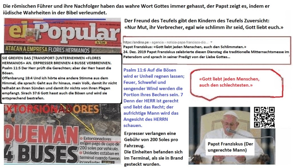 Er wird seine Füße im Blut der Gottlosen baden. 11 Dann wird der Mensch sagen: Wahrlich, es gibt einen Lohn für die Gerechten; Wahrlich, es gibt einen Gott, der auf Erden richtet. Wo ist die Feindesliebe in dieser Anrufung Gottes und in diesen Prophezeiungen? Nirgendwo. Jesus wusste auch im Voraus, dass die Römer sich niemals zu seiner Religion bekehren würden und dass sie seine Botschaften und die seiner treuen Zeugen zerstören würden. Deshalb sagte er Folgendes: Matthäus 7:22 Viele werden an jenem Tag zu mir sagen: Herr, Herr, werden wir nicht in deinem Namen prophezeien und in deinem Namen Dämonen austreiben und in deinem Namen viele Wunder tun? 23 Und dann werde ich ihnen erklären: Ich habe euch nie gekannt; weicht von mir, ihr Übeltäter. So wie die Botschaft in Offenbarung 6:9-10 eine Anspielung auf die Prophezeiung in Psalmen 58:6-11 ist, ist diese Botschaft in Matthäus 7:22-23 eine Anspielung auf diese Prophezeiung, in der klar zum Ausdruck kommt, dass er Gott liebt, aber seine Feinde hasst. Wenn er seine Feinde hasst und kein Heuchler war, dann hat er die Botschaft in Matthäus 5:38-48 nie ausgesprochen. Es waren die religiösen Heuchler, die „Römischen Katholiken“, die mit dieser Botschaft in der Bibel, die lautet „Liebe deine Feinde“, viele Menschen im Namen ihrer Religion bei der unheiligen Inquisition massakrierten, die immer für Götzen und nicht für Gerechtigkeit war, weil Betrug und Gerechtigkeit unvereinbar sind: