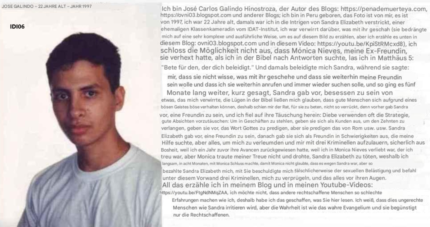 Un duro golpe de realidad es a «Babilonia» la «resurrección» de los justos, que es a su vez la reencarnación de Israel en el tercer milenio: La verdad no destruye a todos, la verdad no duele a todos, la verdad no incomoda a todos: Israel, la verdad, nada más que la verdad, la verdad que duele, la verdad que incomoda, verdades que duelen, verdades que atormentan, verdades que destruyen.Das ist meine Geschichte: José, ein junger Mann, der in katholischen Lehren aufgewachsen ist, erlebte eine Reihe von Ereignissen, die von komplexen Beziehungen und Manipulationen geprägt waren. Mit 19 begann er eine Beziehung mit Monica, einer besitzergreifenden und eifersüchtigen Frau. Obwohl Jose das Gefühl hatte, dass er die Beziehung beenden sollte, versuchte er aufgrund seiner religiösen Erziehung, sie mit Liebe zu ändern. Monicas Eifersucht wurde jedoch immer stärker, insbesondere gegenüber Sandra, einer Klassenkameradin, die Jose Avancen machte. Sandra begann ihn 1995 mit anonymen Telefonanrufen zu belästigen, bei denen sie Geräusche mit der Tastatur machte und auflegte. Bei einer dieser Gelegenheiten gab sie zu, dass sie diejenige war, die anrief, nachdem Jose beim letzten Anruf wütend gefragt hatte: „Wer bist du?“ Sandra rief ihn sofort an, aber bei diesem Anruf sagte sie: „Jose, wer bin ich?“ Jose, der ihre Stimme erkannte, sagte zu ihr: „Du bist Sandra“, woraufhin sie antwortete: „Du weißt bereits, wer ich bin.“ Jose vermied es, sie zur Rede zu stellen. In dieser Zeit drohte Monica, besessen von Sandra, Jose, Sandra zu verletzen, was dazu führte, dass Jose Sandra beschützte und seine Beziehung zu Monica verlängerte, obwohl er sie beenden wollte. Schließlich trennte sich Jose 1996 von Monica und beschloss, Sandra anzusprechen, die zunächst Interesse an ihm gezeigt hatte. Als Jose versuchte, mit ihr über seine Gefühle zu sprechen, ließ Sandra ihn nicht zur Erklärung kommen, sie behandelte ihn mit beleidigenden Worten und er verstand den Grund nicht. Jose entschied sich, sich zu distanzieren, aber 1997 glaubte er, die Gelegenheit zu haben, mit Sandra zu sprechen, in der Hoffnung, dass sie ihre veränderte Einstellung erklären und die Gefühle teilen würde, die sie verschwiegen hatte. Sandra gab ihm jedoch nie klare Antworten und hielt die Intrige mit ausweichenden und kontraproduktiven Verhaltensweisen aufrecht. Angesichts dieser Haltung beschloss Jose, nicht mehr nach ihr zu suchen. Zu diesem Zeitpunkt begann die ständige telefonische Belästigung. Die Anrufe folgten dem gleichen Muster wie 1995 und waren diesmal an das Haus seiner Großmutter väterlicherseits gerichtet, wo Jose lebte. Er war überzeugt, dass es Sandra war, da er ihr vor kurzem seine Nummer gegeben hatte. Diese Anrufe kamen ständig, morgens, nachmittags, nachts und frühmorgens, und dauerten Monate lang an. Wenn ein Familienmitglied antwortete, legte es nicht auf, aber als José antwortete, war das Klicken der Tasten zu hören, bevor er auflegte. Jose bat seine Tante, die Besitzerin der Telefonleitung, eine Aufzeichnung der eingehenden Anrufe von der Telefongesellschaft anzufordern. Er plante, diese Informationen als Beweis zu verwenden, um Sandras Familie zu kontaktieren und seine Besorgnis darüber auszudrücken, was sie mit diesem Verhalten erreichen wollte. Seine Tante spielte sein Argument jedoch herunter und weigerte sich zu helfen. Seltsamerweise schien niemand im Haus, weder seine Tante noch seine Großmutter väterlicherseits, darüber empört zu sein, dass die Anrufe auch am frühen Morgen erfolgten, und sie machten sich nicht die Mühe, herauszufinden, wie sie sie stoppen oder die verantwortliche Person identifizieren könnten. Obwohl José Sandras Anrufe zunächst ignorierte, gab er mit der Zeit nach und kontaktierte Sandra erneut, beeinflusst von biblischen Lehren, die dazu rieten, für diejenigen zu beten, die ihn verfolgten. Sandra manipulierte ihn jedoch emotional, indem sie ihn abwechselnd beleidigte und ihn aufforderte, weiter nach ihr zu suchen. Nach Monaten dieses Kreislaufs entdeckte Jose, dass das alles eine Falle war. Sandra beschuldigte ihn fälschlicherweise der sexuellen Belästigung und als ob das nicht schlimm genug wäre, schickte sie ein paar Kriminelle los, um Jose zu verprügeln. Diese Ereignisse hinterließen tiefe Spuren bei Jose, der nach Gerechtigkeit strebt und diejenigen entlarven will, die ihn manipuliert haben. Außerdem versucht er, den Rat der Bibel zu missachten, wie etwa: Bete für diejenigen, die dich beleidigen, denn indem er diesen Rat befolgte, tappte er in Sandras Falle. Joses Aussage. █ Ich bin José Carlos Galindo Hinostroza, Autor des Blogs: https://penademuerteya.com, https://ovni03.blogspot.com und weiterer Blogs. Ich wurde in Peru geboren, dieses Foto stammt von mir, es wurde 1997 aufgenommen, ich war 22 Jahre alt. Damals war ich in die Intrigen von Sandra Elizabeth, einer ehemaligen Mitschülerin des IDAT-Instituts, verwickelt. Ich war verwirrt darüber, was mit ihr geschah (Sie belästigte mich auf eine sehr komplexe und lange Art, die hier nicht in einem Bild erzählt werden kann, aber ich beschreibe es im unteren Teil dieses Blogs: ovni03.blogspot.com und in diesem Video: https://youtu.be/KpiStRMcxd8). Ich schloss nicht aus, dass Mónica Nieves, meine Ex-Freundin, ihr irgendeine Art von Hexerei angetan hatte. Auf der Suche nach Antworten in der Bibel las ich in Matthäus 5: » Betet für den, der euch beleidigt, » Und in diesen Tagen beleidigte mich Sandra, während sie mir sagte, dass sie nicht wüsste, was mit ihr los sei, dass sie weiterhin meine Freundin sein wolle und dass ich sie immer wieder anrufen und aufsuchen solle. Das ging fünf Monate lang so. Kurz gesagt, Sandra tat so, als sei sie von etwas besessen, um mich in Verwirrung zu halten. Die Lügen in der Bibel ließen mich glauben, dass gute Menschen sich schlecht benehmen können, weil ein böser Geist sie beeinflusst. Deshalb erschien mir der Rat, für sie zu