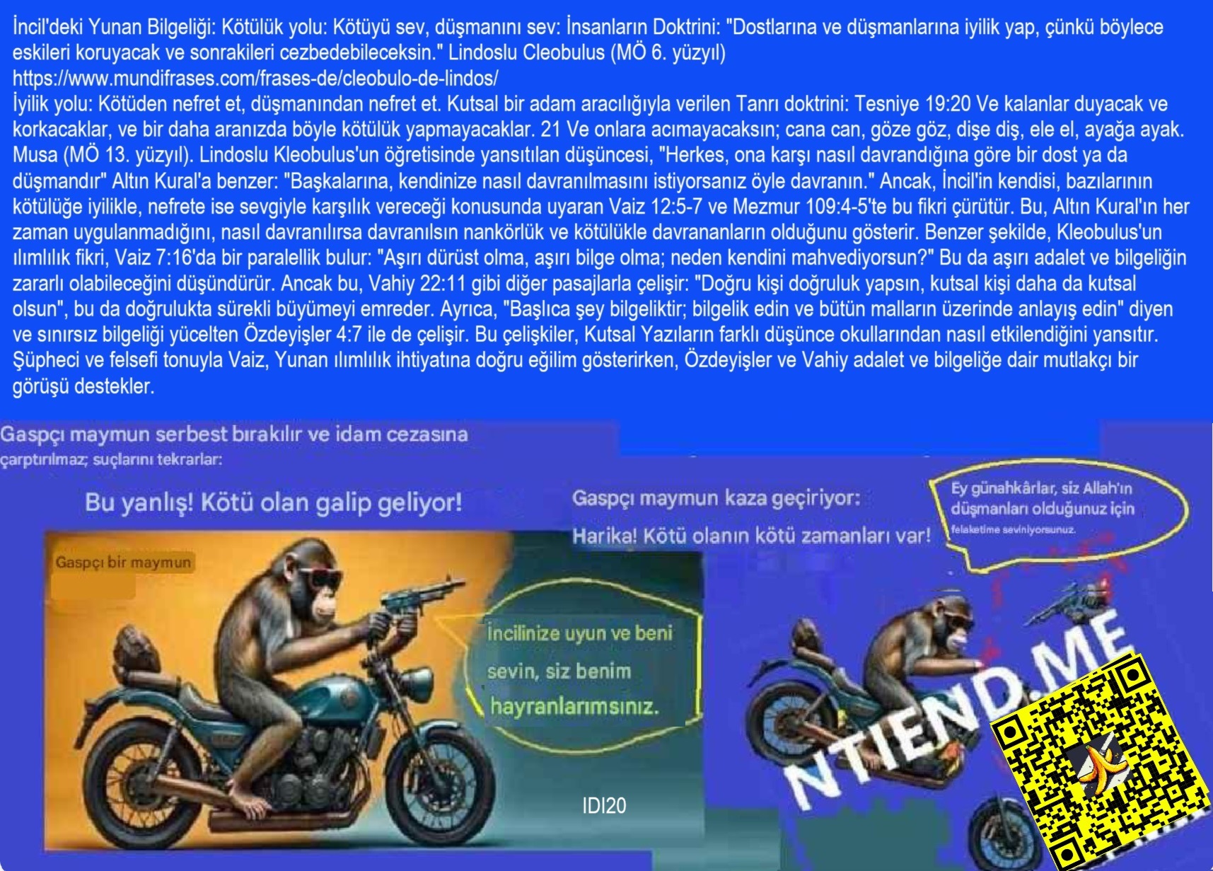 «Kötülükten kim sorumludur, «»Şeytan»» mı yoksa kötülüğü işleyen kişi mi? Aptalca bahanelere kanmayın, çünkü kendi kötülüklerinden sorumlu tuttukları «»Şeytan»» aslında kendileridir. Sapmış bir din adamının tipik bahanesi: «»Ben böyle biri değilim, çünkü bu kötülüğü yapan ben değilim, beni ele geçiren şeytan bunu yapıyor.»» Romalılar «»Şeytan»» gibi davranarak haksız içerikler ürettiler ve bunları Musa’nın yasaları olarak sundular. Amaçları adil içerikleri itibarsızlaştırmaktı. Kutsal Kitap yalnızca gerçekleri değil, aynı zamanda yalanları da içerir. Şeytan, «»iftiracı»» anlamına geldiği için etten ve kandan oluşan bir varlıktır. Romalılar, Efesliler 6:12 mesajının yazarlığını yanlış bir şekilde Pavlus’a atfetmişlerdir. Oysa mücadele et ve kanladır. Sayılar 35:33’te et ve kana karşı ölüm cezası belirtilir ve Tanrı’nın Sodom’a gönderdiği melekler, «»göksel yerlerdeki kötü ruhani varlıkları»» değil, et ve kanı yok etti. Matta 23:15, Ferisilerin takipçilerini kendilerinden bile daha yozlaştırdığını söyleyerek, bir kişinin dış etkiler nedeniyle adaletsiz hale gelebileceğini öne sürüyor. Öte yandan, Daniel 12:10, adaletsizlerin adaletsizlik yapmaya devam edeceğini çünkü bunun onların doğası olduğunu ve yalnızca adil olanların adalet yolunu anlayacağını söylüyor. Bu iki mesaj arasındaki çelişki, İncil’in bazı bölümlerinin birbiriyle tutarsız olduğunu ve mutlak doğruluğunu sorgulattığını gösteriyor. https://naodanxxii.wordpress.com/wp-content/uploads/2025/03/idi20-the-plot.pdf .» «Roma İmparatorluğu, Bahira, Muhammed, İsa ve zulüm gören Yahudilik. Giriş mesajı: Zeus’a tapan Kral IV. Antiochus Epiphanes’in işkencelerine rağmen domuz eti yemeyi reddedenlerin inandıklarına bakın. Yaşlı Eleazar’ın, yedi kardeşi ve anneleriyle birlikte domuz eti yemeyi reddettiği için Yunan Kralı Antiochus tarafından nasıl öldürüldüğüne bakın. Tanrı, sadık Yahudilerin imanla hayatlarını feda ederek bu fedakarlık aracılığıyla sonsuz yaşam almalarını öngören kendi koyduğu bir yasayı ortadan kaldıracak kadar zalim miydi? Tanrı zalim değildir, eğer Tanrı zalim olsaydı en iyisi olmazdı. Tanrı kötülerin dostu değildir, eğer Tanrı kötülerin dostu olsaydı o zaman zalim olurdu ve çözümün değil sorunun bir parçası olurdu. Bu kanunu ortadan kaldıranlar ne İsa’ydı ne de onun öğrencileri. Bunlar Yunanlılarla aynı tanrılara inanan Romalılardı: Jüpiter (Zeus), Aşk Tanrısı (Eros), Minerva (Athena), Neptün (Poseidon), Hem Romalılar hem de Yunanlılar domuz eti ve deniz ürünlerini severlerdi, ancak dindar Yahudiler bu yiyecekleri reddederlerdi. 2.Makabiler 7:1 Yedi kardeş ve anneleri tutuklandı. Kral, onları kırbaç ve öküzlerle döverek, kanunen yasak olan domuz etini yemeye zorlamak istiyordu. 2 İçlerinden biri bütün kardeşler adına konuşarak şöyle dedi: “Bize soru sorarak ne öğrenmek istiyorsun? «»Atalarımızın yasalarını çiğnemektense ölmeyi tercih ederiz.»» 8 O da kendi dilinde, “Domuz eti yemeyeceğim!” diye cevap verdi. Bu yüzden ona da azap edildi. 9 Fakat son nefesini verirken şöyle dedi: Ey suçlu, şimdiki hayatımızı elimizden alıyorsun. Ama Allah, kendi kanunları uğruna ölen bizleri sonsuz yaşama diriltecektir. Mesaj: Dördüncü canavarın doğumu ve ölümü. Aynı tanrıların Greko-Romen ittifakı. Seleukos İmparatorluğu. Deccal’in müjdesine (Doğru olmayanlar için iyi haber, ama yanlış) inanmaktan sakının Adalet düşmanının aldatmacasından kendinizi kurtarmak istiyorsanız şunu düşünün: Roma’nın sahte müjdesini reddetmek için, eğer İsa doğru kişiyse düşmanlarını sevmediğini ve eğer ikiyüzlü değilse düşmanlarına sevgiyi vaaz etmediğini, çünkü uygulamadığı şeyi vaaz etmediğini kabul edin: Süleyman’ın Özdeyişleri 29:27 Doğru kişiler doğru olmayanlardan nefret eder, ve doğru olmayanlar doğru kişilerden nefret eder. Bu, Romalılar tarafından İncil’e uydurulan müjdenin bir parçasıdır: 1.Petrus 3:18 Çünkü Mesih de günahlar için bir kez öldü; doğru olmayanlar için, bizi Tanrı’ya ulaştırmak için. Şimdi bu iftirayı çürüten şuna bakın: Mezmur 118:20 Bu, RAB’bin kapısıdır; İyiler oraya gireceklerdir. 21 Beni işittiğin ve kurtardığın için sana şükredeceğim. 22 İnşaatçıların reddettiği taş temel taşı haline gelmiştir. İsa, ölümünü ve dönüşünü öngören benzetmede düşmanlarını lanetliyor: Luka 20:14 Fakat bağcılar bunu görünce, aralarında şöyle dediler: Bu mirasçıdır; Haydi onu öldürelim de miras bizim olsun. 15 Bunun üzerine onu bağdan dışarı atıp öldürdüler. Peki bağ sahibi onlara ne yapacak? 16 O gelip bu bağcıları yok edecek ve bağı başkalarına verecek. Bunu işittiklerinde, “Hayır!” dediler. 17 İsa onlara baktı ve şöyle dedi: «»Öyleyse, ‘Yapıcıların reddettiği taş, başın köşe taşı oldu’ diye yazılmış olan nedir?»» Babil kralının korkulu rüyası olan bu taştan şöyle söz ediyordu: Daniel 2:31 Ey kral, sen bakarken önünde büyük bir heykel duruyordu. Bu heykelin görkemi çok yüceydi. görünüşü ürkütücüydü. 32 Heykelin başı saf altından, göğsüyle kolları gümüşten, karnıyla kalçaları tunçtan, 33 bacakları demirden, ayaklarının bir kısmı demirden, bir kısmı kildendi. 34 Sen bakıyordun ki, insan eli değmeden bir taş kesildi; İsa, heykelin demirden ve kilden olan ayaklarına vurup onları parçaladı. 35 Demir, kil, tunç, gümüş ve altın parçalandı, yaz harmanlarından çıkan saman çöpleri gibi oldular. rüzgar onları alıp götürdü, hiçbir iz bırakmadı. Fakat heykele çarpan taş büyük bir dağ oldu ve bütün dünyayı doldurdu. Dördüncü canavar, kınanan Roma sah