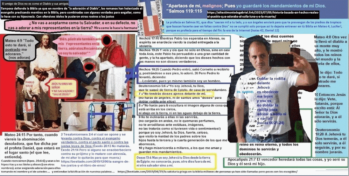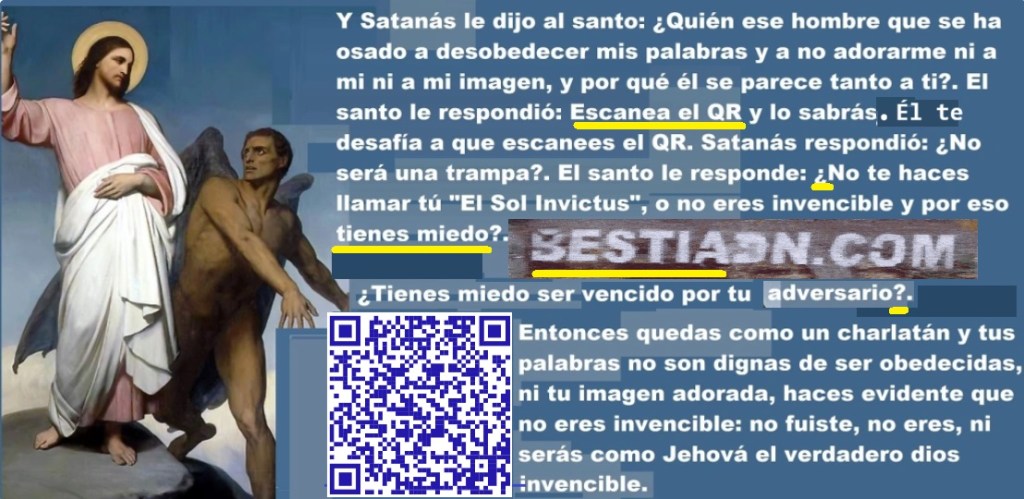 «¿Tú también crees que yo soy Satanás?, pues no, yo no soy tú, yo no me llamo a mí mismo, a pesar de ser carne y sangre, como tú: «El único señor y salvador», pero tú sí lo haces por intermedio de personajes en los cuales pones tus palabras. Adoradores de Zeus que helenizaron la verdadera religión, por eso pides lo que Hebreos 1:6 dice, pero te niego con Salmos 97:7 «¡Tú no eres Yahvé, solo Yahvé es digno de adoración, y aún si fueras el sol, eres precindible, Yahvé puede hacer y deshacer millones de estrellas como tú, ¿qué te crees?»