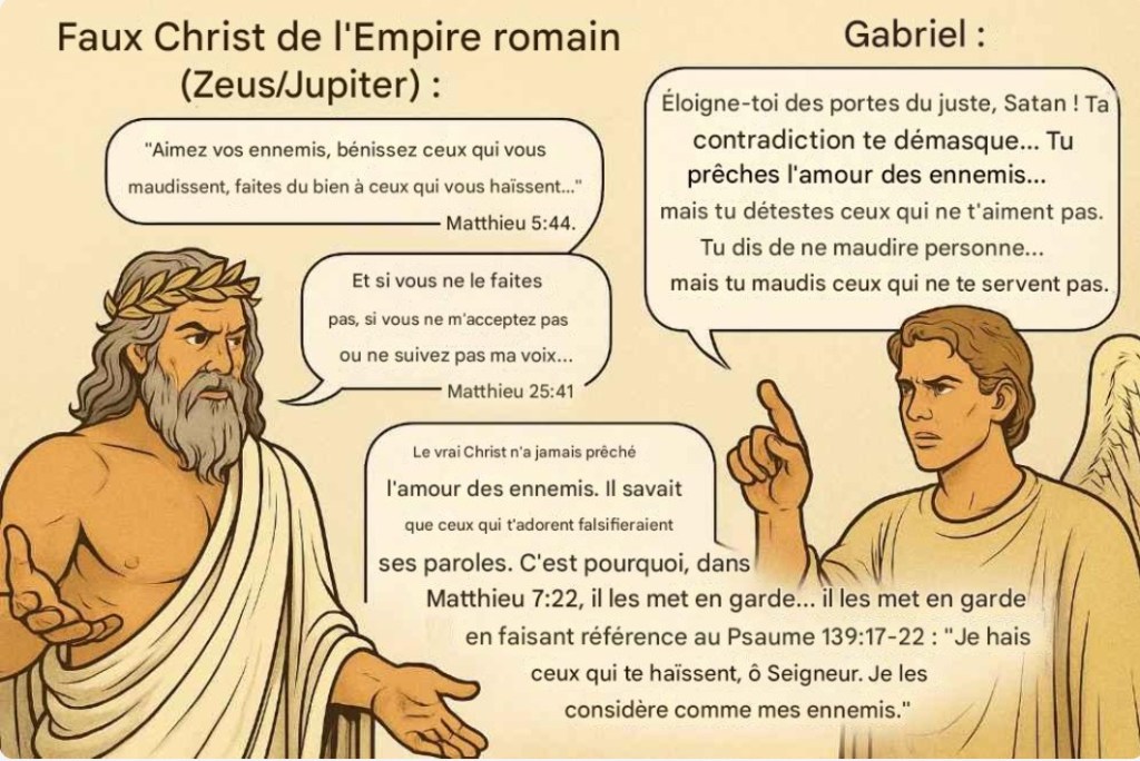 Proverbes 29:27 affirme que le juste a en horreur le méchant. Pourtant, 1 Pierre 3:18 affirme que le juste est mort pour le méchant. Qui peut vraiment croire que quelqu’un puisse mourir ?Pour ceux qu’ils abhorrent ? Croire cela, c’est embrasser une foi aveugle, c’est accepter l’incohérence. Et quand on prêche une foi aveugle, n’est-ce pas parce que le loup veut que sa proie reste aveugle à la tromperie ? Ces contradictions ne viennent pas du ciel, elles sont nées des conciles qui ont falsifié les Écritures. Proverbes 29:27 déclare que le juste haït le méchant. Alors pourquoi 1 Pierre 3:18 affirme-t-il que le juste est mort pour le méchant ? Le juste donnerait-il sa vie pour ceux qu’il hait ? Cette contradiction n’est pas un malentendu : c’est la preuve d’une falsification. Je ne lis pas sans réfléchir. J’ai un haut niveau de raisonnement verbal, et si vous l’avez aussi, vous verrez que quelque chose cloche. Ce n’est là qu’une des nombreuses incohérences de l’Empire romain dans la Bible, forgée lors de ses conciles pas si saints. Ouvrir les yeux, c’est perdre la foi dans les mensonges : c’est voir la lumière de la vérité, l’information véridique que le pouvoir obscur a essayé de cacher… et a essayé de présenter comme Zeus, le dieu aux cheveux longs des Grecs.