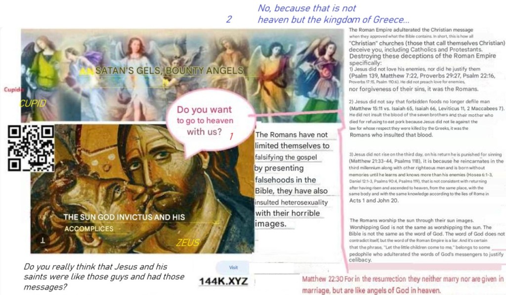 หากจะโต้แย้งคำเตือนในพระคัมภีร์เกี่ยวกับพระคริสต์ที่แตกต่างกันและข่าวประเสริฐที่แตกต่างกันในของปลอม… ทูตสวรรค์จากสวรรค์ประกาศข่าวประเสริฐที่แตกต่างกันและพระคริสต์ที่แตกต่างกัน แต่แตกต่างจากข่าวประเสริฐแห่งโรมในพระคัมภีร์และพระคริสต์แห่งโรมในรูปปั้น (ดาเนียล 12:1-3, วิวรณ์ 12:10-12)