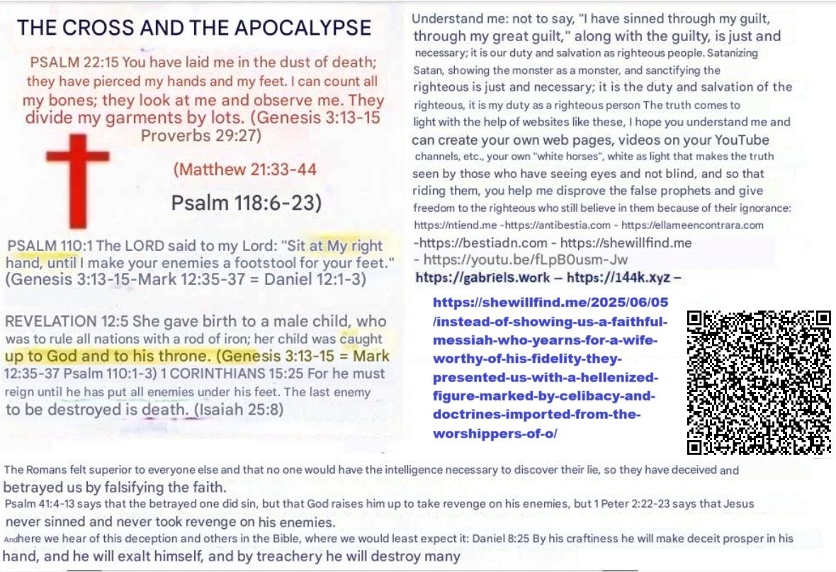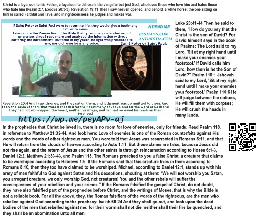 Y hablando de la vida eterna de los justos gracias al pacto santo de la cruz, observa como Jesús jamás se presentó a sí mismo como el salvador a quién se le deba adorar, o como Jehová hecho hombre, y verás más abajo de esa profecía en Salmos 22, como los miserables romanos han seguido tergiversando las profecías, pues así son los hijos del Diablo, calumnian como lo hizo Satanás desde el principio: