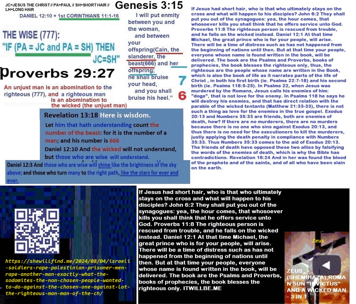 Y hablando de si X=Y e Y=Z entonces Z=X. Y hablando de imbéciles e hipócritas, en 1 Corintios 11:1-16, si Pablo condenaba a los hombres de cabello largo y él era imitador de Cristo, entonces ni Cristo ni Pablo usaban el cabello largo, Cristo y los otros hombres santos usaban el cabello corto, como lo dije hace varios años en un video, debajo del cual, encontrarás la imagen de Zeus y el razonamiento que niega esa imagen como la imagen de Jesús, dónde a su vez muestro el origen griego de la frase: «ama a tus enemigos» (Su autor fue Cleóbulo de Lindos, un griego que vivió en el S. VI AC):