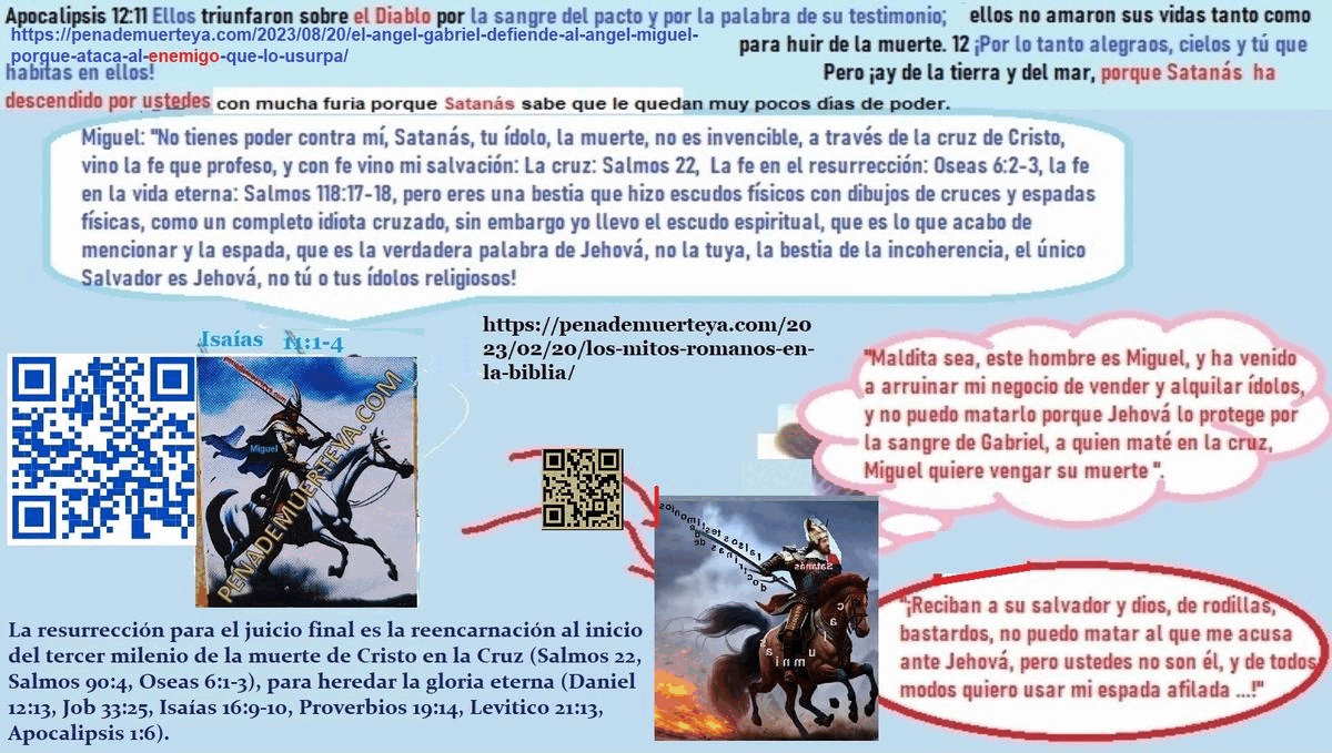 Miguel: «No tienes poder contra mí, Satanás, tu ídolo, la muerte, no es invencible, a través de la cruz de Cristo, vino la fe que profeso, y con fe vino mi salvación: La cruz: Salmos 22, La fe en el resurrección: Oseas 6:2-3, la fe en la vida eterna: Salmos 118:17-18, pero eres una bestia que hizo escudos físicos con dibujos de cruces y espadas físicas, como un completo idiota cruzado, sin embargo yo llevo el escudo espiritual, que es lo que acabo de mencionar y la espada, que es la verdadera palabra de Jehová, no la tuya, la bestia de la incoherencia, el único