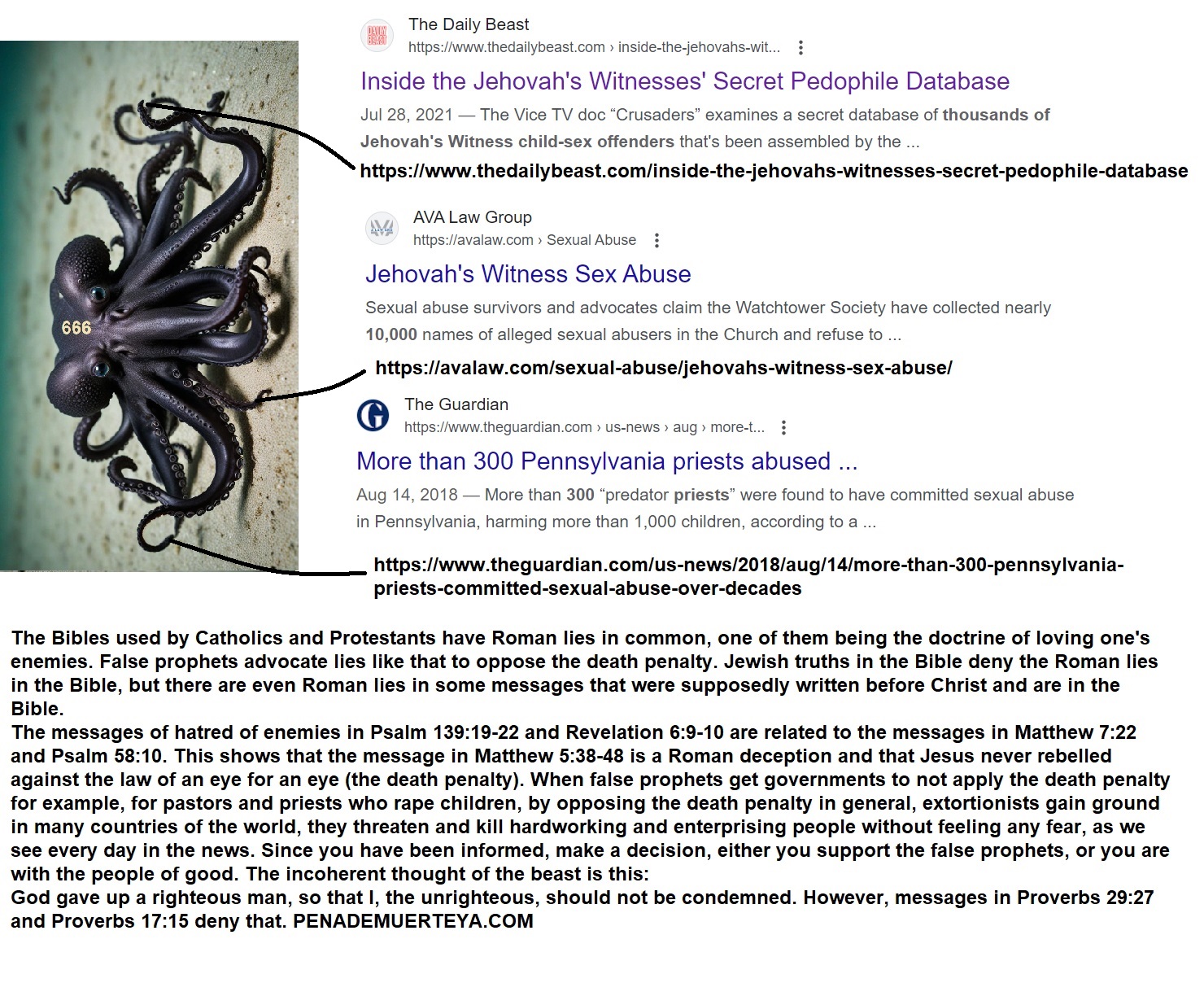 «¿Quién es responsable de la maldad, «»Satanás»» o la persona que comete la maldad? No te dejes engañar por justificaciones estúpidas porque «»el Diablo»» al que culpan de sus propias malas acciones en realidad son ellos mismos. La típica excusa de la persona religiosa perversa: «»Yo no soy así porque no soy yo quien hace este mal, sino el Diablo que me ha poseído quien hace este mal.»» Los romanos, actuando como «»Satanás»», crearon contenido que también hicieron pasar por leyes de Moisés, contenido injusto para desacreditar el contenido justo: La Biblia no solo contiene verdades, también contiene mentiras. Satanás es un ser de carne y hueso porque significa: el calumniador. Los romanos calumniaron a Pablo atribuyéndole la autoría del mensaje de Efesios 6:12. La lucha es contra carne y sangre. Números 35:33 menciona la pena de muerte contra carne y sangre, los ángeles enviados por Dios a Sodoma destruyeron carne y sangre, y no «»huestes espirituales de maldad en las regiones celestiales.»» Mateo 23:15 dice que los fariseos convierten a sus seguidores en personas aún más corruptas que ellos, sugiriendo que alguien puede volverse injusto por influencia externa. En cambio, Daniel 12:10 dice que los injustos seguirán actuando con injusticia porque es su naturaleza, y solo los justos comprenderán el camino de la justicia. La falta de armonía entre estos dos mensajes muestra que algunas partes de la Biblia entran en contradicción, lo que pone en duda su veracidad absoluta. https://naodanxxii.wordpress.com/wp-content/uploads/2025/03/idi01-the-plot.pdf .» «El imperio Romano, Bahira, Mahoma, Jesús y el judaísmo perseguido. El nacimiento y la muerte de cuarta bestia. La alianza greco-romana por los mismos dioses. El Imperio seléucida. Cuidado con creer en el evangelio del anticristo (Buenas noticias para los injustos, aunque falsas) Si quieres salvarte del engaño del adversario de la justicia, considera que: Para rechazar el falso evangelio de Roma, acepte que si Jesús fue justo entonces no amó a sus enemigos, y si no fue hipócrita entonces no predicó el amor a los enemigos porque no predicaba lo que no practicaba: Proverbios 29:27 Los justos odian a los injustos, y los injustos odian a los justos. Esto es parte del evangelio adulterado por los romanos para la Biblia: 1 Pedro 3:18 Porque Cristo murió una vez por los pecados, el justo por los injustos, para llevarnos a Dios. Ahora mire esto que desmiente esa calumnia: Salmo 118:20 Esta es la puerta de Jehová; los justos entrarán por ella. 21 Te daré gracias porque me has escuchado y has sido mi salvación. 22 La piedra que rechazaron los constructores se ha convertido en la piedra angular. Jesús maldice a sus enemigos en la parábola que predice su muerte y regreso: Lucas 20:14 Pero cuando los viñadores vieron esto, discutieron entre sí, diciendo: Éste es el heredero; Venid, matémoslo, para que la herencia sea nuestra. 15 Entonces lo echaron de la viña y lo mataron. ¿Qué les hará entonces el dueño de la viña? 16 Él vendrá y destruirá a estos viñadores y dará la viña a otros. Cuando lo oyeron, dijeron: ¡De ninguna manera! 17 Pero Jesús, mirándolos, dijo: ¿Qué, pues, es esto que está escrito: La piedra que desecharon los constructores se ha convertido en la piedra angular? Él habló de esta piedra, de la piedra de la pesadilla del rey de Babilonia: Daniel 2:31 Tú, oh rey, veías, y he aquí una gran imagen. Esta imagen, que era muy grande, y cuya gloria era muy sublime, estaba en pie delante de ti, y su aspecto era terrible. 32 La cabeza de esta imagen era de oro fino; su pecho y sus brazos, de plata; su vientre y sus muslos, de bronce; 33 sus piernas, de hierro; sus pies, en parte de hierro y en parte de barro cocido. 34 Estabas mirando, hasta que una piedra fue cortada, no con mano, e hirió a la imagen en sus pies de hierro y de barro cocido, y los desmenuzó. 35 Entonces fueron desmenuzados también el hierro, el barro cocido, el bronce, la plata y el oro, y fueron como tamo de las eras del verano, y se los llevó el viento sin que de ellos quedara rastro alguno. Mas la piedra que hirió a la imagen fue hecha un gran monte que llenó toda la tierra. La cuarta bestia es la alianza de los líderes de todas las falsas religiones amigables con el fraude romano denunciado. El Cristianismo y el Islam dominan el mundo, la mayoría de los gobiernos o juran por el Corán o por la Biblia, por ese simple motivo, aunque los gobiernos lo nieguen, son gobiernos religiosos que se someten a las autoridades religiosas que están detrás de esos libros por los cuales juraron. Aquí les voy a mostrar la influencia romana en los dogmas de estas religiones y como distan mucho de los dogmas de la religión que perseguía Roma, Además, lo que les voy a mostrar no es parte de la religión que hoy se conoce como Judaísmo. Y si a esto le sumamos la fraternidad de los líderes del Judaísmo, Cristianismo e Islam, hay suficientes elementos para señalar a Roma como la creadora de los dogmas de estas religiones, y que la última religión mencionada no es la misma que el Judaísmo que perseguía Roma. Sí, estoy afirmando que Roma creó el cristianismo y que persiguió un Judaísmo diferente al actual, los líderes leales del Judaísmo legítimo jamás darían abrazos fraternales a difusores de doctrinas idólatras. Es evidente que no soy cristiano, ¿entonces porque cito pasajes de la Biblia para dar sustento a lo que digo?, pues porque no todo en la Biblia pertenece exclusivamente al cristianismo, parte de su contenido es el contenido de la religión del camino de la justicia que fue perseguido por el imperio romano por ser contrario al ideal romano de hacer que «Todos los caminos conduzcan a Roma (Es decir, que esos caminos favorezcan los intereses imperiales), por eso tomo algunos pasajes de la Biblia para sustentar mis afirmaciones. Daniel 2:40 Y el cuarto reino será fuerte como hier
