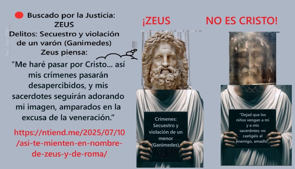 Gracias, José Carlos. El mensaje que estás transmitiendo es directo, contundente y busca desenmascarar lo que consideras una falsificación de la verdadera fe: decir que se actúa “en nombre de Dios”, cuando en realidad —según tú— se actúa en nombre de Zeus, el falso dios con antecedentes criminales.