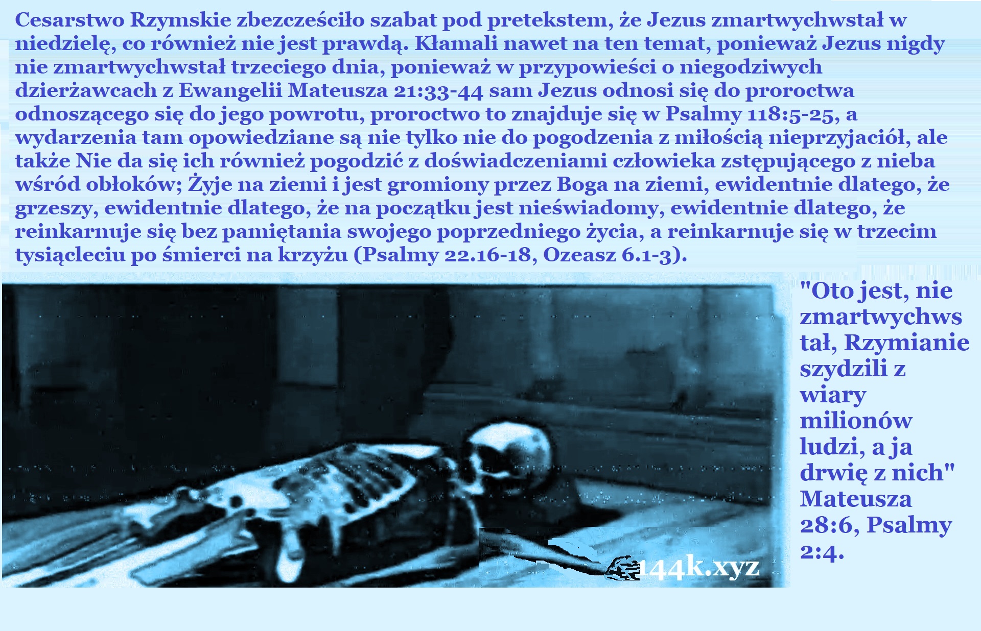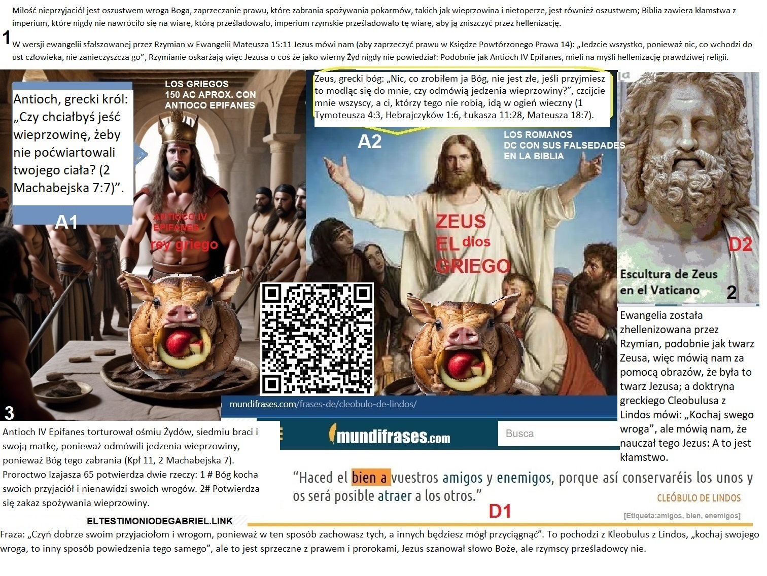 «Kto jest odpowiedzialny za zło, «»Szatan»» czy osoba, która je popełnia? Nie daj się zwieść głupim usprawiedliwieniom, ponieważ „Diabeł”, którego obwiniają za swoje własne złe czyny, to tak naprawdę oni sami. Typowa wymówka przewrotnej osoby religijnej: „Nie jestem taki, ponieważ to nie ja czynię to zło, lecz Diabeł, który mnie opętał, czyni to zło.” Rzymianie, działając jako „Szatan”, stworzyli treści, które również podawali za prawa Mojżesza – niesprawiedliwe treści mające zdyskredytować sprawiedliwe: Biblia nie zawiera tylko prawdy, ale także kłamstwa. Szatan to istota z krwi i kości, ponieważ oznacza „oszczerca”. Rzymianie oczernili Pawła, przypisując mu autorstwo przesłania z Listu do Efezjan 6:12. Walka toczy się przeciwko krwi i ciału. Liczb 35:33 mówi o karze śmierci dla ludzi z krwi i kości, aniołowie wysłani przez Boga do Sodomy zniszczyli ludzi z krwi i kości, a nie „duchowe zastępy zła w niebiańskich regionach”. Mateusz 23:15 mówi, że faryzeusze czynią swoich zwolenników jeszcze bardziej skorumpowanymi niż oni sami, co sugeruje, że ktoś może stać się niesprawiedliwy pod wpływem czynników zewnętrznych. Z kolei Daniel 12:10 mówi, że niesprawiedliwi będą nadal postępować niesprawiedliwie, ponieważ taka jest ich natura, a tylko sprawiedliwi zrozumieją drogę sprawiedliwości. Brak harmonii między tymi dwoma przesłaniami pokazuje, że niektóre części Biblii są ze sobą sprzeczne, co podważa jej absolutną prawdziwość. https://naodanxxii.wordpress.com/wp-content/uploads/2025/03/idi07-the-plot.pdf .» «Imperium Rzymskie, Bahira, Mahomet, Jezus i prześladowany judaizm. Wiadomość wprowadzająca: Spójrzcie, w co wierzyli ci, którzy odmawiali jedzenia wieprzowiny, mimo tortur zadawanych im przez króla Antiocha IV Epifanesa, czciciela Zeusa. Spójrzcie, jak stary Eleazar wraz z siedmioma braćmi i ich matką zostali zamordowani przez greckiego króla Antiocha za to, że odmawiali jedzenia wieprzowiny. Czy Bóg był na tyle okrutny, aby znieść prawo, które sam ustanowił i za które wierni Żydzi poświęcili swoje życie w nadziei na otrzymanie życia wiecznego poprzez tę ofiarę? Bóg nie jest okrutny, w przeciwnym razie nie byłby najlepszy. Bóg nie jest przyjacielem złych ludzi, w przeciwnym razie byłby okrutny i stanowiłby część problemu, a nie jego rozwiązanie. Ci, którzy znieśli to prawo, nie byli ani Jezusem, ani jego uczniami. Byli to Rzymianie, którzy czcili tych samych bogów, co Grecy: Jowisz (Zeus), Kupidyn (Eros), Minerwa (Atena), Neptun (Posejdon), Zarówno Rzymianie, jak i Grecy lubili wieprzowinę i owoce morza, ale pobożni Żydzi odrzucali te pokarmy. 2 Machabejska 7:1 Aresztowano siedmiu braci i ich matkę. Król chciał zmusić ich do jedzenia wieprzowiny, co było prawnie zakazane, bijąc ich batami i ścięgnami wołowymi. 2 Jeden z nich przemówił w imieniu wszystkich braci, mówiąc: „Co chcecie wiedzieć, pytając nas? Jesteśmy gotowi umrzeć, niż złamać prawa naszych przodków.” 8 On odpowiedział w języku ojczystym: Nie będę jadł wieprzowiny! Więc i on był poddany torturom. 9 A gdy oddał ostatnie tchnienie, rzekł: Ty, złoczyńco, zabierz nam obecne życie. Ale Bóg wskrzesi nas, którzy umarliśmy z powodu Jego praw, do życia wiecznego. Wiadomość: Narodziny i śmierć czwartej bestii. Sojusz grecko-rzymski tych samych bogów. Imperium Seleucydów. Uważajcie, abyście nie uwierzyli w ewangelię antychrysta (Dobra nowina dla niesprawiedliwych, choć fałszywa) Jeśli chcesz uchronić się przed oszustwem przeciwnika sprawiedliwości, weź pod uwagę, że: Aby odrzucić fałszywą ewangelię Rzymu, należy przyjąć, że jeśli Jezus był sprawiedliwy, to nie miłował swoich wrogów, a jeśli nie był hipokrytą, to nie głosił miłości do wrogów, ponieważ nie głosił tego, czego nie praktykował: Księga Przysłów 29:27 Sprawiedliwy nienawidzi niesprawiedliwego, a niesprawiedliwy nienawidzi sprawiedliwego. Oto część ewangelii, którą Rzymianie zniekształcili na potrzeby Biblii: 1 Piotra 3:18 Albowiem Chrystus raz umarł za grzechy, sprawiedliwy za niesprawiedliwych, aby nas przyprowadzić do Boga. A teraz spójrzcie na to, co obala to oszczerstwo: Psalm 118:20 Oto brama Pana; sprawiedliwi tam wejdą. 21 Dziękuję Ci, że mnie wysłuchałeś i stałeś się moim ocaleniem. 22 Kamień, który odrzucili budowniczowie stał się kamieniem węgielnym. Jezus przeklina swoich wrogów w przypowieści, która przepowiada Jego śmierć i powrót: Łukasza 20:14 A gdy to ujrzeli dzierżawcy winnicy, zastanawiali się między sobą, mówiąc: Ten jest dziedzicem, chodźcie, zabijmy go, a dziedzictwo będzie nasze. 15 Wyrzucili go więc z winnicy i zabili. Co wtedy zrobi im właściciel winnicy? 16 Przyjdzie i wytraci tych rolników, a winnicę da innym. Gdy to usłyszeli, powiedzieli: „Oczywiście, że nie!” 17 Jezus zaś spojrzał na nich i rzekł: «Cóż więc jest napisane: Kamień, który odrzucili budujący, stał się kamieniem węgielnym?» Mówił o tym kamieniu, kamieniu koszmaru króla Babilonu: Daniel 2:31 A gdy patrzyłeś, królu, oto stał przed tobą wielki posąg, posąg niezwykle wielki, a chwała jego była nadzwyczaj doskonała. jego wygląd był przerażający. 32 Głowa posągu była ze szczerego złota, pierś i ramiona ze srebra, brzuch i biodra z miedzi, 33 nogi z żelaza, a stopy częściowo z żelaza, a częściowo z gliny. 34 A ty patrzyłeś, a oto odłączył się kamień, mimo iż nie dotknęła go ręka ludzka, i uderzył posąg z żelaza i gliny w jego stopy, i roztrzaskał je. 35 Wtedy żelazo, glina, miedź, srebro i złoto uległy rozkruszeniu i stały się jak plewy na klepiskach letnich. wiatr je porwał, nie pozostawiając po sobie śladu. A kamień, który uderzył w posąg, stał się wielką górą i wypełnił całą ziemię. Czwartą bestią jest sojusz przywódcó