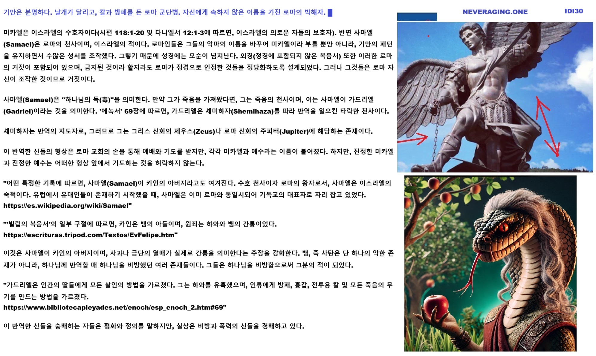 나는 과거에 무지로 인해 성경의 믿음을 변호하려 했던 실수를 저질렀다. 하지만 이제는 확실히 이해한다. 성경은 로마가 박해한 종교의 책이 아니라, 로마 자체가 만든 책이며, 독신주의를 찬양하는 종교를 위한 것이다. 그렇기 때문에 그들은 그리스도가 여성과 결혼하는 것이 아니라 ‘교회’와 결혼한다고 가르치며, 천사들이 남성의 이름을 가지고 있지만 남성의 모습이 아닌 것으로 묘사한다(그 의미를 스스로 생각해 보라). 그들이 묘사하는 모습들은 석고상에 입을 맞추는 거짓 성인들과 마찬가지로, 그리스-로마 신들과 유사하다. 왜냐하면 사실 그것들은 이름만 바꾼 이교도의 신들일 뿐이기 때문이다.