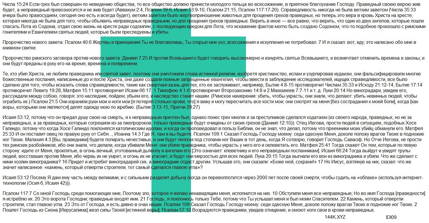 Исаия 53:12, потому что он предал душу свою на смерть, и к неправедным причтен был, однако понес грех многих и за преступников сделался ходатаем (из своего народа, праведных, но не за неправедных, а за праведных, которые согрешили из-за лжепророков, только праведные будут очищены от своих грехов (Даниил 12:10)): Отец Иегова, прости людей в ситуациях, подобных Хосе Галиндо, потому что когда Хосе Галиндо поклонялся католическим идолам, и когда он проповедовал в пользу Библии, он не знал, что делал, потому что преемники моих убийц обманули его. Матфея 25:33 И он поставит овец по правую руку от Себя…, Иоанна 14:3 Где Я, там и вы будете. Псалом 109:1 Сказал Господь Господу моему: седи одесную Меня, доколе положу врагов Твоих в подножие ног Твоих. Малахия 4:3 [Вы, праведники] будете попирать нечестивых, и они будут пеплом под стопами ног Ваших в тот день, когда Я сотворю, говорит Господь Саваоф. Но Отче Иегова, не прости тех римских разбойников, ибо они знали, что делали, когда убивали Меня: они убили праведника, чтобы украсть у него его и оклеветать его. Матфея 25:41 Тогда скажет Он тем, которые по левую сторону: идите от Меня, проклятые, в огонь вечный, уготованный дьяволу и ангелам его [Это означает: клеветнику и его неправедным посланникам]. Исаия 66:24 Тогда выйдут и увидят трупы людей, восставших против Меня, ибо червь их не умрет, и огонь их не угаснет; и будут они мерзостью для всех людей. Лука 20:15 Тогда выгнали его вон из виноградника и убили. Что же сделает с ними хозяин виноградника? 16 Придет и истребит виноградарей сих, а виноградник отдаст другим. Услышав это, они сказали: «Боже мой, сохрани!» 17 Но Иисус, взглянув на них, сказал: что же значит написанное: «камень, который отвергли строители, тот самый сделался главою угла»?