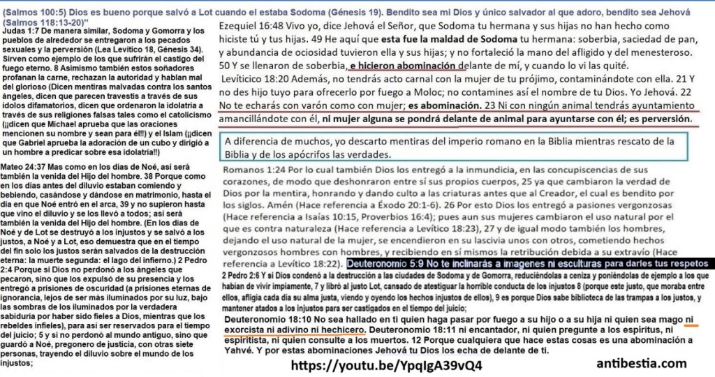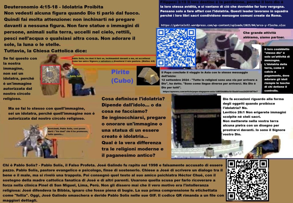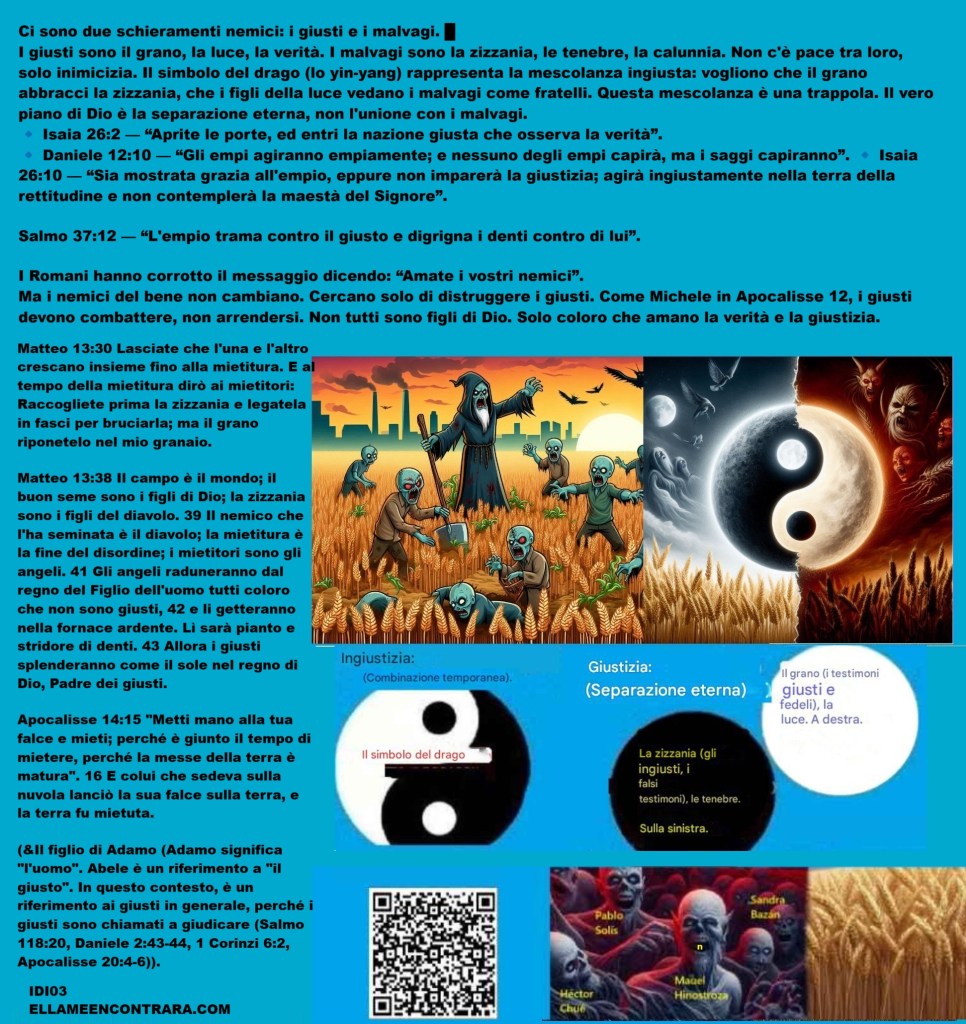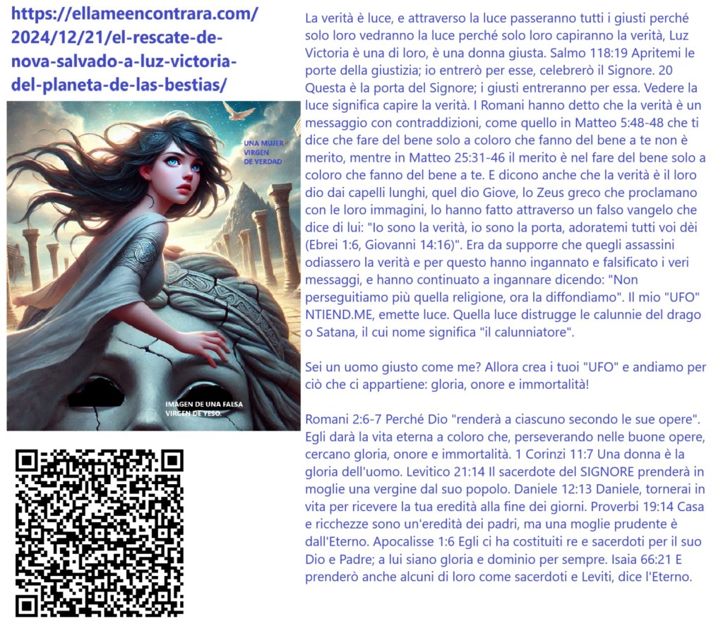 . https://itwillbedotme.wordpress.com/wp-content/uploads/2025/04/holy-weapons-armas-divinas.xlsx I malvagi possono diventare buoni? No, i malvagi non possono diventare buoni. I malvagi, nemici tra loro, possono fare amicizia? Sì. Dobbiamo noi, i buoni, permettere che i malvagi uniscano le forze? No, perché useranno la loro unione contro di noi, i giusti. Le menzogne della Bibbia mi hanno fatto credere che le persone buone possano comportarsi male a causa di uno spirito maligno. Ecco perché il consiglio di pregare per una certa donna chiamata Sandra non mi è sembrato così assurdo, perché Sandra prima fingeva di essere amica, e sono caduto nel suo inganno. Io non chiamo Dio bugiardo; chiamo bugiardi i romani, che hanno adulterato molti messaggi dei suoi messaggeri facendoli passare per verità nella Bibbia. Ecco il passo ingannevole nella Bibbia che suggerisce implicitamente che i malvagi possano diventare buoni: Luca 5:32 — Non sono venuto a chiamare i giusti, ma i peccatori al pentimento. In questo messaggio c’è un doppio inganno: oltre a quello già menzionato, il messaggio scarta l’idea che il giusto possa peccare. Tuttavia, i Salmi 41, Salmi 118, Michea 7 e Daniele 12 suggeriscono chiaramente che i giusti possano peccare quando vivono nelle tenebre (ignoranza), e che per smettere di peccare debbano conoscere la verità (la luce di un messaggio rivelatore e giusto che distrugga la loro ignoranza, promossa dalle persone malvagie). Ma questo non vale per i malvagi, che affermano che la verità è il loro dio dai capelli lunghi, Giove o Zeus, a cui hanno semplicemente cambiato nome, oltre a dire che la verità è un insieme di messaggi contraddittori. I romani calunniarono Paolo attribuendogli l’autorevolezza di Efesini 6:12, dove si dice che la lotta non è contro carne e sangue. Ma la lotta è contro carne e sangue. Numeri 35:33 menziona la pena di morte contro carne e sangue, gli angeli inviati da Dio a Sodoma distrussero carne e sangue, e non le «»forze spirituali di malvagità nei luoghi celesti»». I romani, agendo come «»Satana»», crearono contenuti che passarono anche come leggi di Mosè, contenuti ingiusti per screditare i contenuti giusti. La Bibbia non contiene solo verità; contiene anche menzogne. https://x.com/jinete_del/status/1865027698583609818 Vuoi conoscere altre menzogne che i malvagi fingono di non notare? Ecco un altro esempio: La morte di Stefano (Atti 7) Secondo Atti 7, nei suoi ultimi momenti di vita, Stefano, come se amasse coloro che lo stavano lapidando a morte, chiese che il loro crimine fosse perdonato. Tuttavia, in Apocalisse 6:9-10, Stefano e altri santi uccisi per predicare la parola di Dio gridano vendetta.