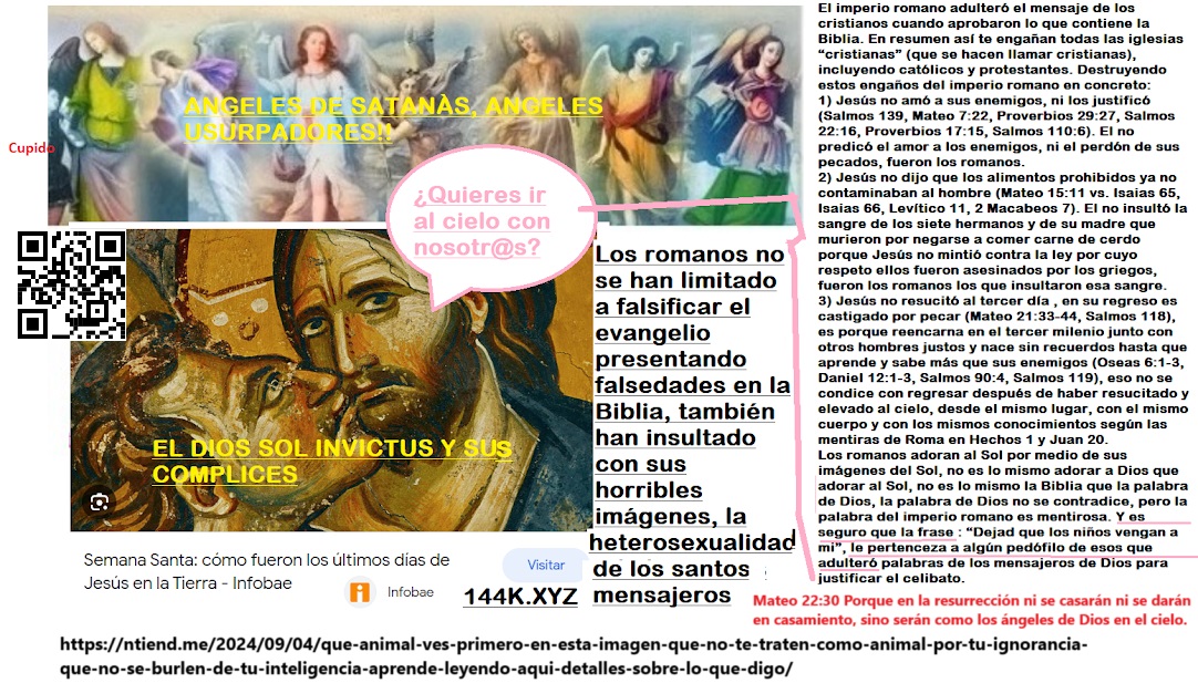 Cupid is condemned to hell along with the other pagan gods (The fallen angels for their rebellion against justice, sent to eternal punishment). █ https://youtu.be/eJ-dAcMNWQA  Quoting these passages does not mean defending the entire Bible. If 1 John 5:19 says that “the whole world is under the power of the evil one,” but rulers swear on the Bible, then the Devil rules with them. If the Devil rules with them, then fraud also rules with them. Therefore, the Bible contains part of that fraud, camouflaged among truths. By connecting those truths, we can expose their deceptions. Righteous people need to know these truths so that, if they have been deceived by lies added to the Bible or other similar books, they can free themselves from them. Daniel 12:7 And I heard the man clothed in linen, who was above the waters of the river, when he raised his right hand and his left hand to heaven and swore by Him who lives forever that it shall be for a time, times, and half a time. And when the power of the holy people is completely shattered, all these things shall be finished. Considering that ‘Devil’ means ‘Slanderer,’ it is natural to expect that the Roman persecutors, being the adversaries of the saints, later bore false witness against the saints and their messages. Thus, they themselves are the Devil, and not an intangible entity that enters and exits people, as they made us believe precisely with passages like Luke 22:3 (“Then Satan entered Judas…”), Mark 5:12-13 (the demons entering the pigs), and John 13:27 (“After the morsel, Satan entered him”). This is my purpose: to help righteous people not waste their power believing in the lies of impostors who have adulterated the original message, which never asked anyone to kneel before anything or pray to anything that had ever been visible. It is no coincidence that in this image, promoted by the Roman Church, Cupid appears alongside other pagan gods. They have given the names of the true saints to these false gods, but look at how these men dress and how they wear their long hair. All this goes against faithfulness to God’s laws because it is a sign of rebellion, a sign of the fallen angels (Deuteronomy 22:5). https://eltrabajodegabriel.wordpress.com/wp-content/uploads/2025/03/idi02-time-and-the-freedom-of-the-righteous.jpg
