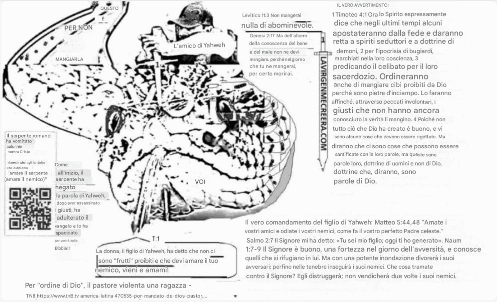 » Pensavo che stessero facendo stregoneria su di lei, ma era lei la strega. Questi sono i miei argomenti. (https://bestiadn.com/wp-content/uploads/2025/04/idi03.pdf) – È tutto questo il tuo potere, strega malvagia? Camminando sul bordo della morte lungo il sentiero oscuro, ma cercando la luce, interpretando le luci proiettate sulle montagne per non fare un passo falso, per evitare la morte. █ La notte calava sulla strada principale. Un manto di oscurità copriva il percorso tortuoso che si snodava tra le montagne. Non camminava senza meta. La sua meta era la libertà, ma il viaggio era appena iniziato. Con il corpo intorpidito dal freddo e lo stomaco vuoto da giorni, non aveva altra compagnia se non l’ombra allungata proiettata dai fari dei camion che ruggivano accanto a lui, avanzando senza fermarsi, indifferenti alla sua presenza. Ogni passo era una sfida, ogni curva una nuova trappola da cui doveva uscire illeso. Per sette notti e mattine, fu costretto ad avanzare lungo la sottile linea gialla di una strada stretta con appena due corsie, mentre camion, autobus e rimorchi sfrecciavano a pochi centimetri dal suo corpo. Nel buio, il fragore assordante dei motori lo avvolgeva, e le luci dei camion che arrivavano da dietro proiettavano il loro bagliore sulla montagna di fronte a lui. Allo stesso tempo, altri camion si avvicinavano in senso opposto, costringendolo a decidere in frazioni di secondo se accelerare il passo o restare fermo nella sua precaria traversata, dove ogni movimento significava la differenza tra la vita e la morte. La fame era una bestia che lo divorava dall’interno, ma il freddo non era meno spietato. Nella sierra, le prime ore del mattino erano artigli invisibili che penetravano fino alle ossa. Il vento lo avvolgeva con il suo respiro gelido, come se volesse spegnere l’ultima scintilla di vita che gli restava. Si rifugiava dove poteva, a volte sotto un ponte, altre volte in un angolo di cemento che gli offriva un minimo di riparo. Ma la pioggia non perdonava. L’acqua filtrava nei suoi vestiti laceri, si incollava alla sua pelle e gli rubava quel poco di calore che ancora conservava. I camion continuavano la loro marcia, e lui, con la testarda speranza che qualcuno provasse compassione, alzava la mano, aspettando un gesto di umanità. Ma gli autisti passavano oltre. Alcuni con sguardi di disprezzo, altri semplicemente ignorandolo, come se fosse un fantasma. Di tanto in tanto, qualche anima compassionevole si fermava e gli offriva un breve passaggio, ma erano pochi. La maggior parte lo vedeva come un fastidio, un’ombra sulla strada, qualcuno che non valeva la pena aiutare. In una di quelle notti interminabili, la disperazione lo spinse a cercare cibo tra gli avanzi lasciati dai viaggiatori. Non provava vergogna ad ammetterlo: lottò per il cibo con i piccioni, strappando pezzi di biscotti induriti prima che loro potessero farli sparire. Era una lotta impari, ma lui era determinato: non era disposto a inginocchiarsi davanti a nessuna immagine, né ad accettare nessun uomo come «unico signore e salvatore». Non era disposto a compiacere quei sinistri individui che lo avevano già rapito tre volte per divergenze religiose, quelli che con le loro calunnie lo avevano portato a camminare su quella linea gialla. In un altro momento, un uomo buono gli offrì un pezzo di pane e una bibita. Un gesto piccolo, ma nel suo dolore, quella gentilezza fu un balsamo. Ma l’indifferenza era la norma. Quando chiedeva aiuto, molti si allontanavano, come se temessero che la sua miseria fosse contagiosa. A volte, un semplice «no» bastava a spegnere ogni speranza, ma in altre occasioni, il disprezzo si rifletteva in parole fredde o sguardi vuoti. Non capiva come potessero ignorare qualcuno che a malapena si reggeva in piedi, come potessero assistere al crollo di un uomo senza battere ciglio. Eppure, andava avanti. Non perché avesse forze, ma perché non aveva altra scelta. Continuò lungo la strada, lasciandosi alle spalle chilometri d’asfalto, notti senza riposo e giorni senza cibo. Le avversità lo colpivano con tutto ciò che avevano, ma lui resisteva. Perché nel profondo, anche nella disperazione più assoluta, bruciava ancora in lui la scintilla della sopravvivenza, alimentata dal desiderio di libertà e giustizia. Salmi 118:17 «»Io non morirò, io vivrò per raccontare le opere del Signore. 18 Il Signore mi ha castigato duramente, ma non mi ha consegnato alla morte.»» Salmi 41:4 «»Io ho detto: Signore, abbi misericordia di me e guariscimi, perché confesso pentito di aver peccato contro di te.»» Giobbe 33:24-25 «»Dio avrà pietà di lui e dirà: Liberalo dal scendere nella fossa, ho trovato un riscatto; 25 allora la sua carne tornerà fresca come nell’infanzia, ed egli ritornerà ai giorni della sua giovinezza.»» Salmi 16:8 «»Ho sempre posto il Signore davanti a me; perché egli è alla mia destra, non sarò scosso.»» Salmi 16:11 «»Mi mostrerai il sentiero della vita; nella tua presenza vi è pienezza di gioia; delizie alla tua destra per sempre.»» Salmi 41:11-12 «»Da questo saprò che mi hai gradito: se il mio nemico non trionferà su di me. 12 Quanto a me, nella mia integrità mi hai sostenuto e mi hai fatto stare alla tua presenza per sempre.»» Apocalisse 11:4 «»Questi testimoni sono i due ulivi e i due candelabri che stanno davanti al Dio della terra.»» Isaia 11:2 «»E riposerà su di lui lo Spirito del Signore: spirito di sapienza e di intelligenza, spirito di consiglio e di potenza, spirito di conoscenza e di timore del Signore.»» ________________________________________ Ho commesso l’errore di difendere la fede nella Bibbia, ma per ignoranza. Tuttavia, ora vedo che non è il libro guida della religione che Roma perseguitò, ma di quella che essa stessa creò per compiacersi con il celibato. Per questo predicarono un Cristo che non sposa una donna, ma la sua chiesa, e angeli che, pur avendo nomi maschili, non sembrano uomini