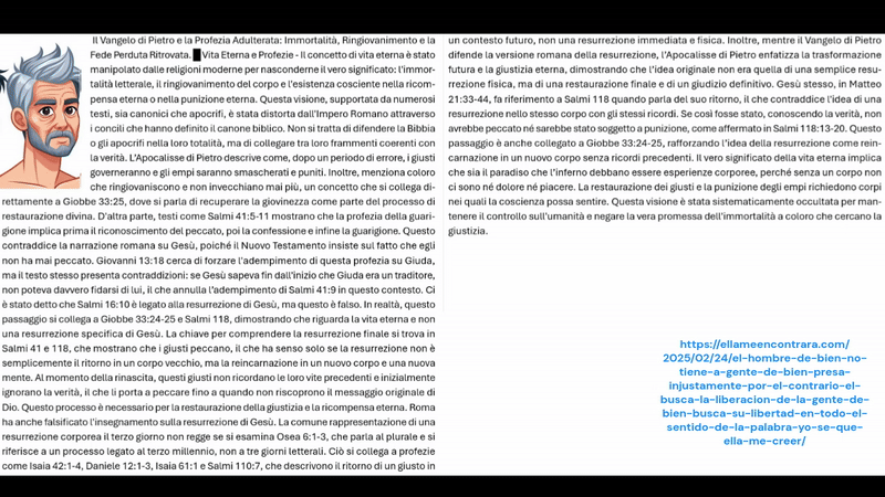 • La menzione di «Mi troverà in tempo» e l’attenzione alla salvezza per i giusti potrebbero essere interpretate come una speranza personale o collettiva di un intervento divino o di una riunione, possibilmente con una figura messianica o una persona cara, in un contesto di conflitto globale o di inganno da parte di false narrazioni religiose, come suggerito dalla critica dell’influenza romana sui testi biblici e dall’invito a discernere la verità dalla falsità.