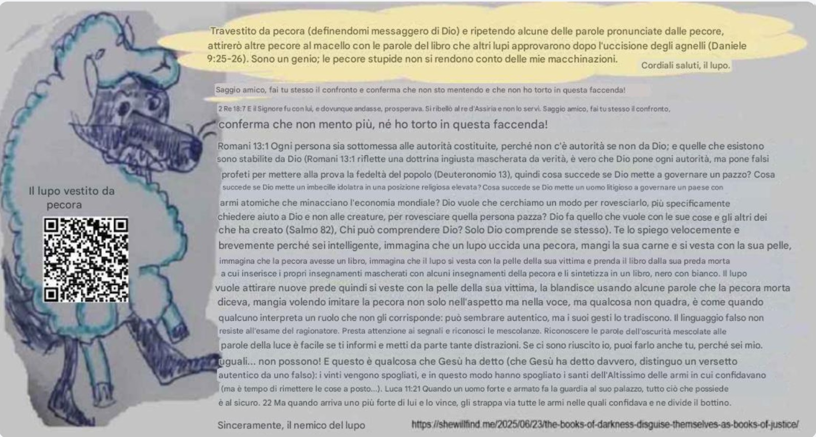 https://naodanxxii.wordpress.com/wp-content/uploads/2025/03/idi03-the-plot.pdf .» «La religione che difendo si chiama giustizia. █ La troverò quando lei troverà me, e lei crederà a ciò che dico. L’Impero Romano ha tradito l’umanità inventando religioni per soggiogarla. Tutte le religioni istituzionalizzate sono false. Tutti i libri sacri di queste religioni contengono frodi. Tuttavia, ci sono messaggi che hanno senso. E ce ne sono altri, mancanti, che possono essere dedotti dai legittimi messaggi di giustizia. Daniele 12:1-13 — «»Il principe che combatte per la giustizia sorgerà per ricevere la benedizione di Dio»». Proverbi 18:22 — «»Una moglie è la benedizione che Dio dà all’uomo»». Levitico 21:14 — «»Dovrà sposare una vergine della sua fede, perché è della sua gente, che sarà liberata quando sorgeranno i giusti»». 📚 Cos’è una religione istituzionalizzata? Una religione istituzionalizzata si ha quando una credenza spirituale viene trasformata in una struttura di potere formale, progettata per controllare le persone. Cessa di essere una ricerca individuale della verità o della giustizia e diventa un sistema dominato da gerarchie umane, al servizio del potere politico, economico o sociale. Ciò che è giusto, vero o reale non ha più importanza. L’unica cosa che conta è l’obbedienza. Una religione istituzionalizzata include: chiese, sinagoghe, moschee, templi. Potenti leader religiosi (sacerdoti, pastori, rabbini, imam, papi, ecc.). Testi sacri «»ufficiali»» manipolati e fraudolenti. Dogmi che non possono essere messi in discussione. Regole imposte alla vita personale delle persone. Riti e rituali obbligatori per «»appartenere»». È così che l’Impero Romano, e in seguito altri imperi, hanno usato la fede per soggiogare le persone. Hanno trasformato il sacro in un business. E la verità in eresia. Se credi ancora che obbedire a una religione equivalga ad avere fede, ti hanno mentito. Se credi ancora ai loro libri, credi alle stesse persone che hanno crocifisso la giustizia. Non è Dio che parla nei suoi templi. È Roma. E Roma non ha mai smesso di parlare. Svegliati. Chi cerca giustizia non ha bisogno di un permesso. Né di un’istituzione.