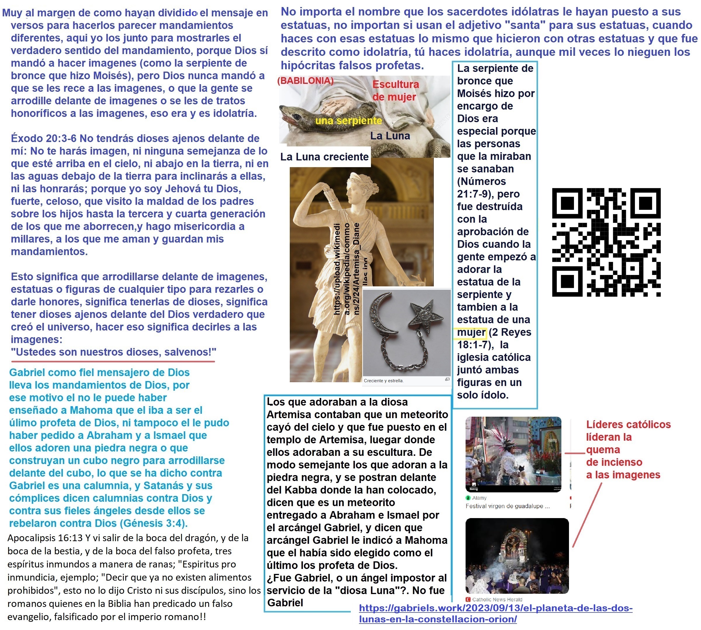 hace 0 segundos @markork1702  Ese viejo truco de curas como Luis Toro lo hice polvo hace meses. No se trata de no hacer imágenes, se trata de no hacerlas para honrarlas; es decir, Éxodo 20:4 no significa nada sin Éxodo 20:5. Por eso el rey Ezequías destruyó la serpiente de bronce que Moisés había hecho, porque empezaron a adorarla (2 Reyes 18:4). Dicho esto, si Roma no respetó un mandamiento tan fundamental, presentando en cambio una expresión ambigua como “amarás a Dios sobre todas las cosas”, y no esos mandamientos claros, no es de esperar que haya respetado todo lo que persiguió. Por lo tanto, la Biblia tiene falsedades, porque pasó por los ojos corruptos e idólatras del Imperio Romano en sus nada santos concilios.