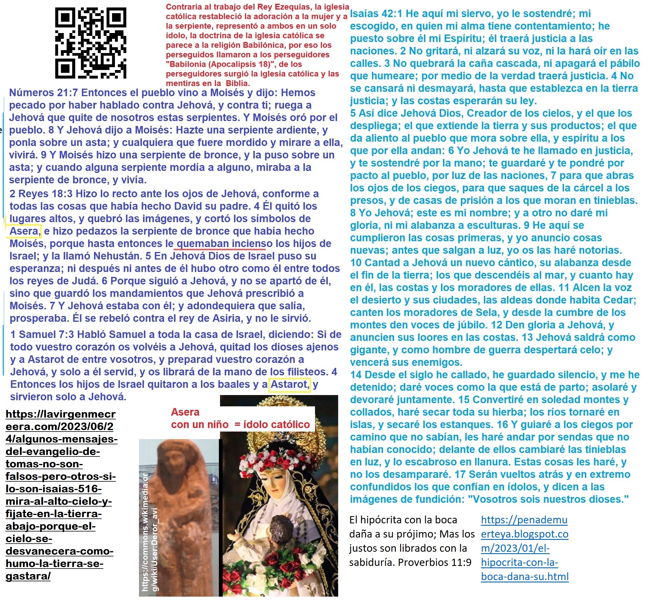 hace 1 segundo Seguro dirán: “No adoramos imágenes, las veneramos, como haces con las fotos de tus seres queridos.” ¿Acaso serías capaz de romper esas imágenes religiosas que dices solo venerar, así como podrías romper una foto de un familiar? Idolatras: el nombre que le des al verbo no cambia tus acciones. No me vengan con trucos de curas como Luis Toro. Ese viejo argumento lo hice polvo hace meses. No se trata de no hacer imágenes, sino de no hacerlas para honrarlas; es decir, Éxodo 20:4 no significa nada sin Éxodo 20:5. Por eso el rey Ezequías destruyó la serpiente de bronce que Moisés había hecho, porque empezaron a adorarla (2 Reyes 18:4). Dicho esto, si Roma no respetó un mandamiento tan fundamental, presentando en cambio una expresión ambigua como “amarás a Dios sobre todas las cosas” en lugar de esos mandamientos claros, no es de esperar que haya respetado todo lo que persiguió. Por lo tanto, la Biblia tiene falsedades, porque pasó por los ojos corruptos e idólatras del Imperio Romano en sus nada santos concilios.