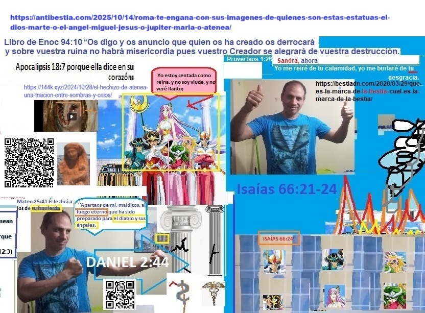 «¿Quién es responsable de la maldad, «»Satanás»» o la persona que comete la maldad? No te dejes engañar por justificaciones estúpidas porque «»el Diablo»» al que culpan de sus propias malas acciones en realidad son ellos mismos. La típica excusa de la persona religiosa perversa: «»Yo no soy así porque no soy yo quien hace este mal, sino el Diablo que me ha poseído quien hace este mal.»» Los romanos, actuando como «»Satanás»», crearon contenido que también hicieron pasar por leyes de Moisés, contenido injusto para desacreditar el contenido justo: La Biblia no solo contiene verdades, también contiene mentiras. Satanás es un ser de carne y hueso porque significa: el calumniador. Los romanos calumniaron a Pablo atribuyéndole la autoría del mensaje de Efesios 6:12. La lucha es contra carne y sangre. Números 35:33 menciona la pena de muerte contra carne y sangre, los ángeles enviados por Dios a Sodoma destruyeron carne y sangre, y no «»huestes espirituales de maldad en las regiones celestiales.»» Mateo 23:15 dice que los fariseos convierten a sus seguidores en personas aún más corruptas que ellos, sugiriendo que alguien puede volverse injusto por influencia externa. En cambio, Daniel 12:10 dice que los injustos seguirán actuando con injusticia porque es su naturaleza, y solo los justos comprenderán el camino de la justicia. La falta de armonía entre estos dos mensajes muestra que algunas partes de la Biblia entran en contradicción, lo que pone en duda su veracidad absoluta. https://naodanxxii.wordpress.com/wp-content/uploads/2025/03/idi01-the-plot.pdf .» «El imperio Romano, Bahira, Mahoma, Jesús y el judaísmo perseguido. El nacimiento y la muerte de cuarta bestia. La alianza greco-romana por los mismos dioses. El Imperio seléucida. Cuidado con creer en el evangelio del anticristo (Buenas noticias para los injustos, aunque falsas) Si quieres salvarte del engaño del adversario de la justicia, considera que: Para rechazar el falso evangelio de Roma, acepte que si Jesús fue justo entonces no amó a sus enemigos, y si no fue hipócrita entonces no predicó el amor a los enemigos porque no predicaba lo que no practicaba: Proverbios 29:27 Los justos odian a los injustos, y los injustos odian a los justos. Esto es parte del evangelio adulterado por los romanos para la Biblia: 1 Pedro 3:18 Porque Cristo murió una vez por los pecados, el justo por los injustos, para llevarnos a Dios. Ahora mire esto que desmiente esa calumnia: Salmo 118:20 Esta es la puerta de Jehová; los justos entrarán por ella. 21 Te daré gracias porque me has escuchado y has sido mi salvación. 22 La piedra que rechazaron los constructores se ha convertido en la piedra angular. Jesús maldice a sus enemigos en la parábola que predice su muerte y regreso: Lucas 20:14 Pero cuando los viñadores vieron esto, discutieron entre sí, diciendo: Éste es el heredero; Venid, matémoslo, para que la herencia sea nuestra. 15 Entonces lo echaron de la viña y lo mataron. ¿Qué les hará entonces el dueño de la viña? 16 Él vendrá y destruirá a estos viñadores y dará la viña a otros. Cuando lo oyeron, dijeron: ¡De ninguna manera! 17 Pero Jesús, mirándolos, dijo: ¿Qué, pues, es esto que está escrito: La piedra que desecharon los constructores se ha convertido en la piedra angular? Él habló de esta piedra, de la piedra de la pesadilla del rey de Babilonia: Daniel 2:31 Tú, oh rey, veías, y he aquí una gran imagen. Esta imagen, que era muy grande, y cuya gloria era muy sublime, estaba en pie delante de ti, y su aspecto era terrible. 32 La cabeza de esta imagen era de oro fino; su pecho y sus brazos, de plata; su vientre y sus muslos, de bronce; 33 sus piernas, de hierro; sus pies, en parte de hierro y en parte de barro cocido. 34 Estabas mirando, hasta que una piedra fue cortada, no con mano, e hirió a la imagen en sus pies de hierro y de barro cocido, y los desmenuzó. 35 Entonces fueron desmenuzados también el hierro, el barro cocido, el bronce, la plata y el oro, y fueron como tamo de las eras del verano, y se los llevó el viento sin que de ellos quedara rastro alguno. Mas la piedra que hirió a la imagen fue hecha un gran monte que llenó toda la tierra. La cuarta bestia es la alianza de los líderes de todas las falsas religiones amigables con el fraude romano denunciado. El Cristianismo y el Islam dominan el mundo, la mayoría de los gobiernos o juran por el Corán o por la Biblia, por ese simple motivo, aunque los gobiernos lo nieguen, son gobiernos religiosos que se someten a las autoridades religiosas que están detrás de esos libros por los cuales juraron. Aquí les voy a mostrar la influencia romana en los dogmas de estas religiones y como distan mucho de los dogmas de la religión que perseguía Roma, Además, lo que les voy a mostrar no es parte de la religión que hoy se conoce como Judaísmo. Y si a esto le sumamos la fraternidad de los líderes del Judaísmo, Cristianismo e Islam, hay suficientes elementos para señalar a Roma como la creadora de los dogmas de estas religiones, y que la última religión mencionada no es la misma que el Judaísmo que perseguía Roma. Sí, estoy afirmando que Roma creó el cristianismo y que persiguió un Judaísmo diferente al actual, los líderes leales del Judaísmo legítimo jamás darían abrazos fraternales a difusores de doctrinas idólatras. Es evidente que no soy cristiano, ¿entonces porque cito pasajes de la Biblia para dar sustento a lo que digo?, pues porque no todo en la Biblia pertenece exclusivamente al cristianismo, parte de su contenido es el contenido de la religión del camino de la justicia que fue perseguido por el imperio romano por ser contrario al ideal romano de hacer que «Todos los caminos conduzcan a Roma (Es decir, que esos caminos favorezcan los intereses imperiales), por eso tomo algunos pasajes de la Biblia para sustentar mis afirmaciones. Daniel 2:40 Y el cuarto reino será fuerte como hier