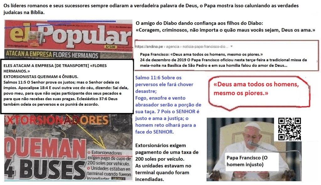 Ele lavará os pés no sangue dos ímpios. 11 Então dirá o homem: Certamente há recompensa para o justo; Certamente existe um Deus que julga na terra. Onde está o amor aos inimigos nesta invocação a Deus e nestas profecias? Em lugar nenhum. Jesus também sabia de antemão que os romanos nunca se converteriam à sua religião e que destruiriam as suas mensagens e as das suas testemunhas fiéis, por isso ele disse isto: Mateus 7:22 Muitos me dirão naquele dia: Senhor, Senhor, não profetizamos em teu nome, e expulsamos demônios em teu nome, e não fizemos muitos milagres em teu nome? 23 E então lhes direi: Nunca vos conheci; apartai-vos de mim, vós que praticais a iniqüidade. Assim como a mensagem em Apocalipse 6:9-10 é uma alusão à profecia em Salmos 58:6-11, esta mensagem em Mateus 7:22-23 é uma alusão a esta profecia onde fica claro que ele ama a Deus, mas odeia seus inimigos, se ele odeia seus inimigos e ele não era um hipócrita, então ele nunca disse a mensagem em Mateus 5:38-48, foram os hipócritas religiosos “católicos romanos”, que com aquela mensagem na Bíblia que diz “amai os vossos inimigos”, massacraram muitas pessoas em nome da sua religião na profana inquisição, que sempre foi a favor dos ídolos e não da justiça, porque a fraude e a justiça são incompatíveis: